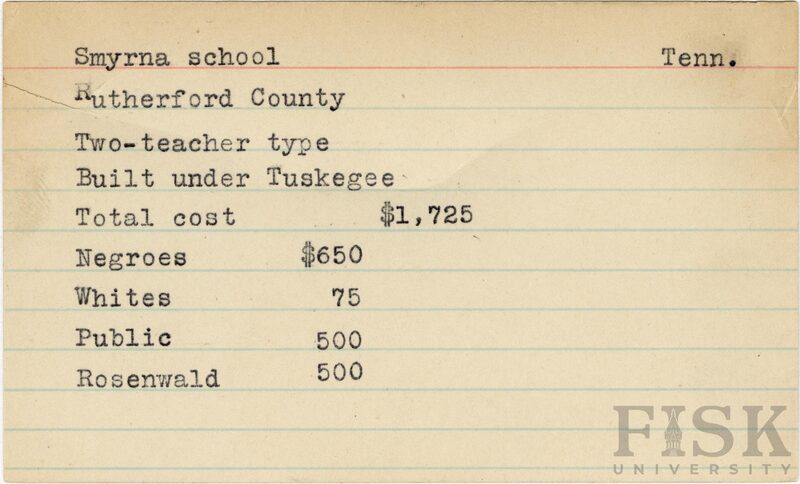 - School card from Rosenwald Fund for Smyrna School in Rutherford County, Tennessee