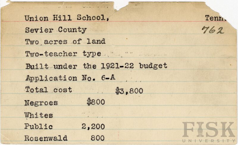 - School card from Rosenwald Fund for Union Hill School in Sevier County, Tennessee
