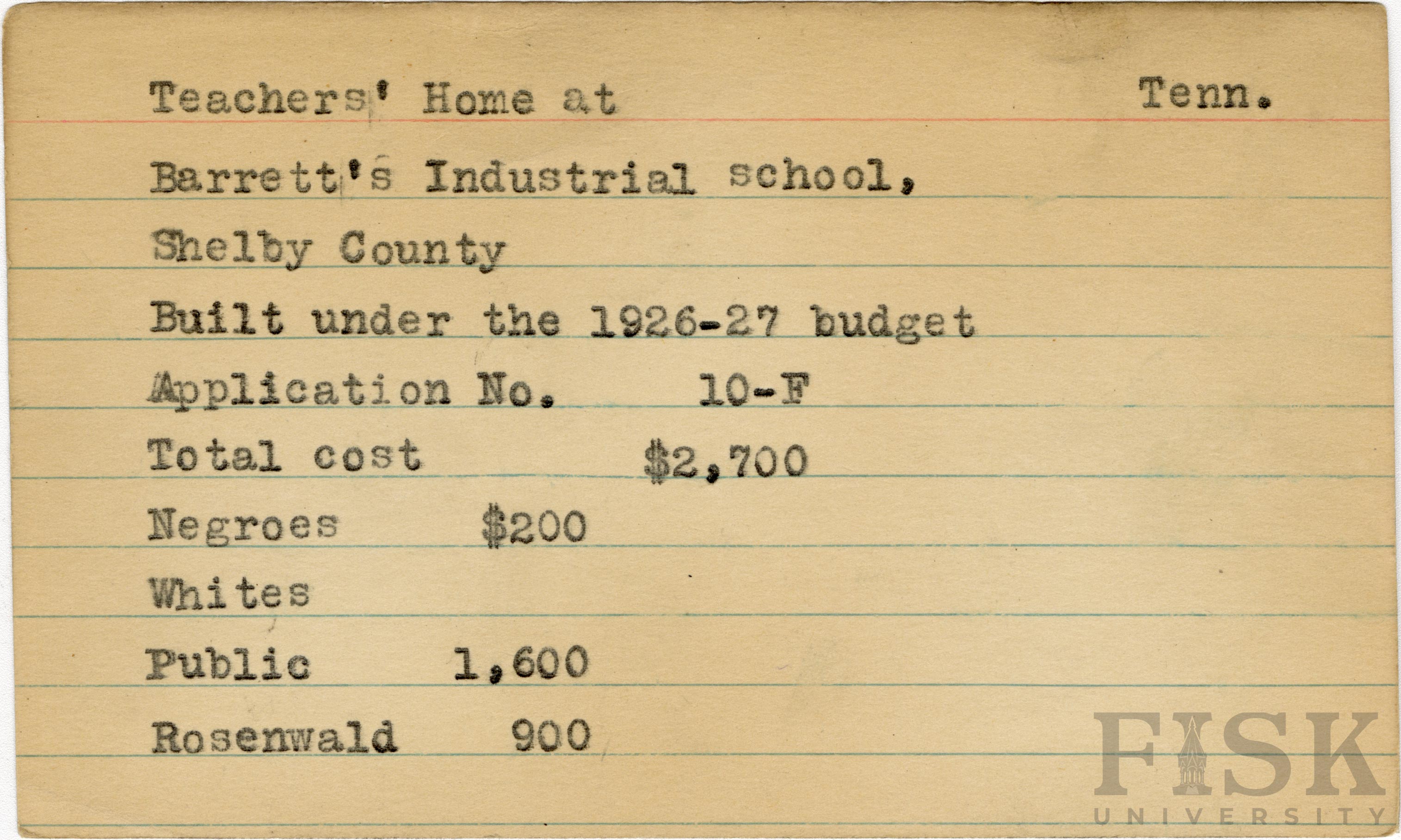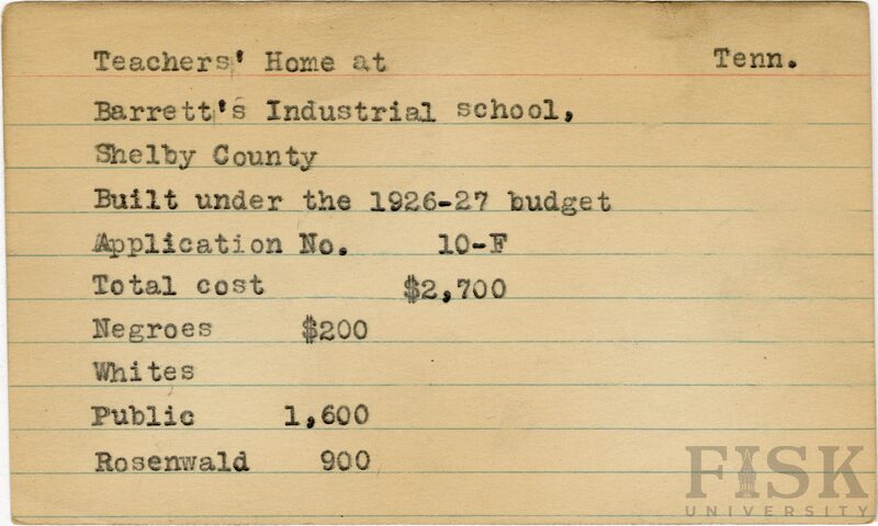 - School card from Rosenwald Fund for the teacher's home at Barrett's Industrial School in Shelby County, Tennessee
