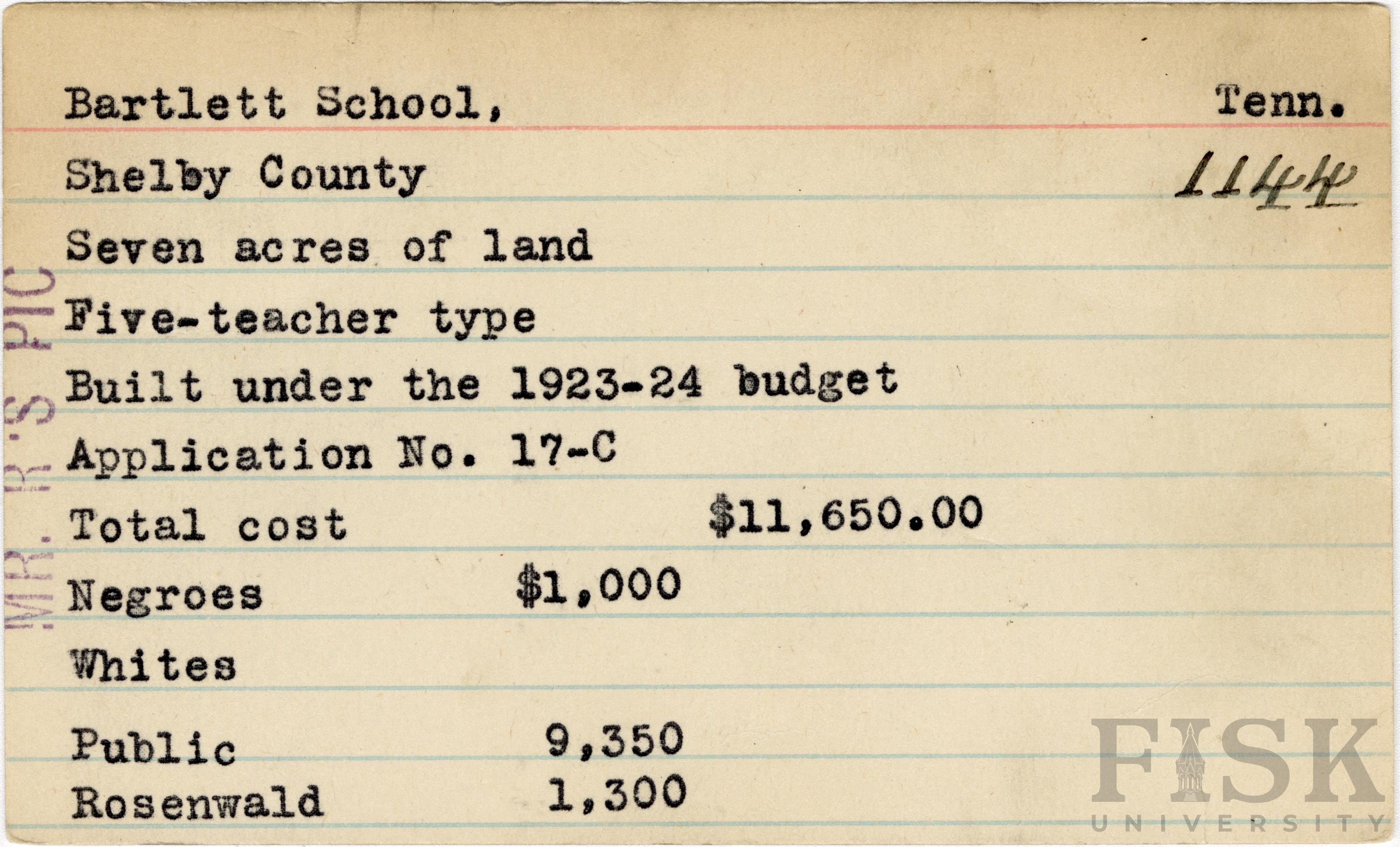 School card from Rosenwald Fund for Bartlett School in Shelby County, Tennessee with a note on the card that says, "Mr. R's Pic"