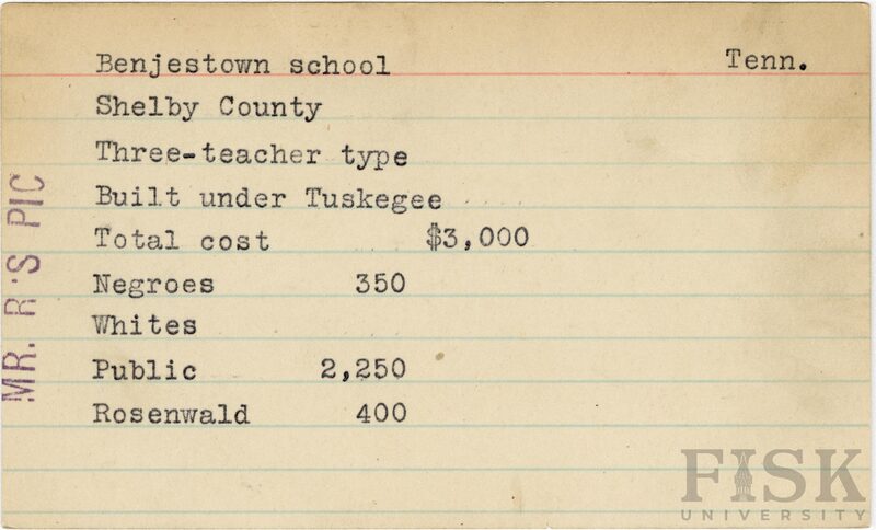 - School card from Rosenwald Fund for Benjestown School in Shelby County, Tennessee with a note on the card that says, "Mr. R's Pic"