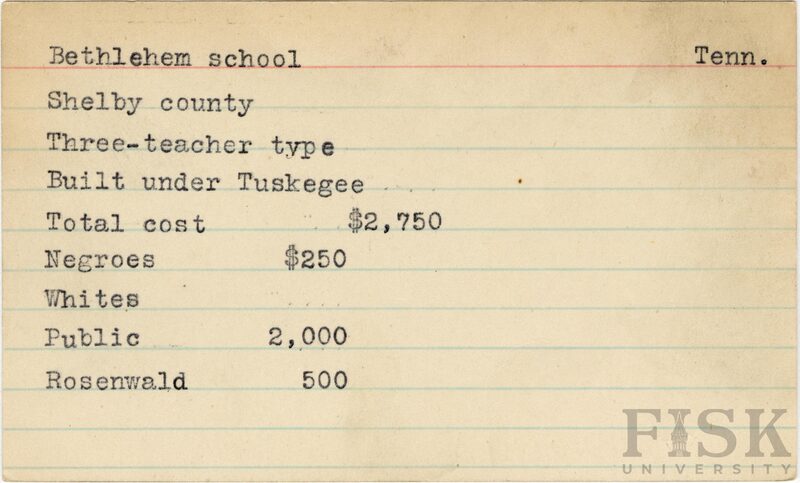 - School card from Rosenwald Fund for Bethlehem School in Shelby County, Tennessee