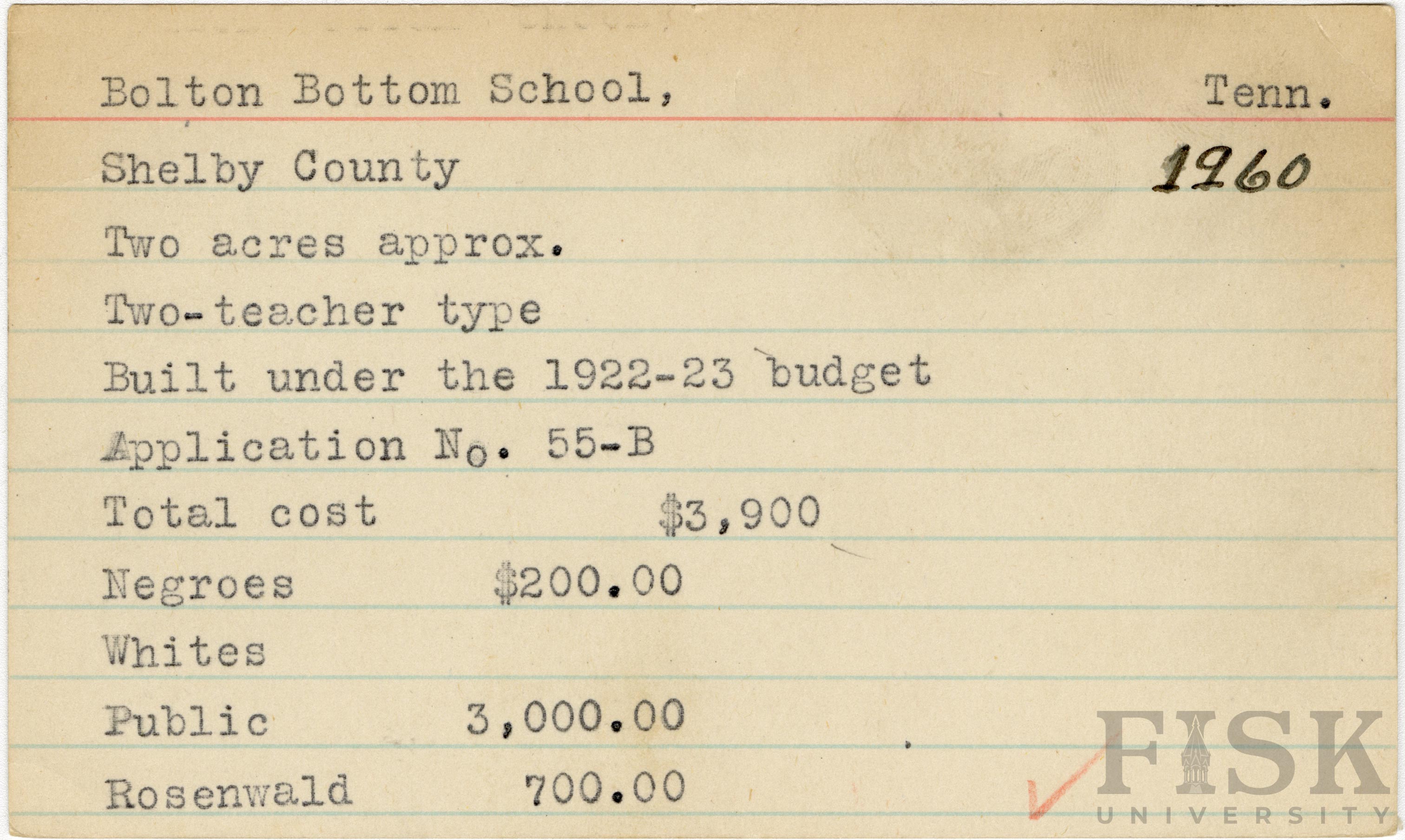 - School card from Rosenwald Fund for Bolton Bottom School in Shelby County, Tennessee
