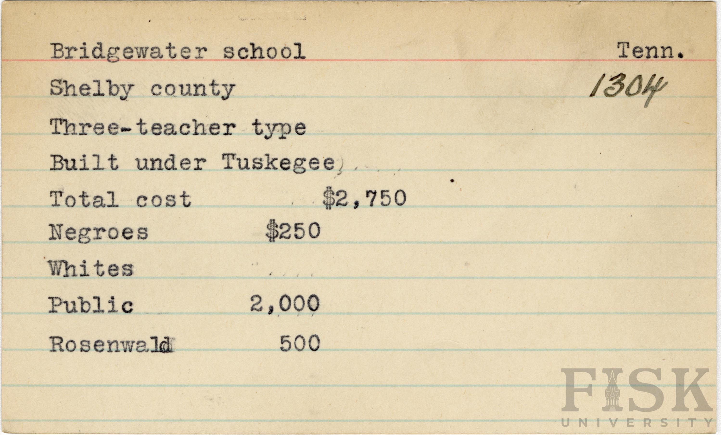 - School card from Rosenwald Fund for Bridgewater School in Shelby County, Tennessee