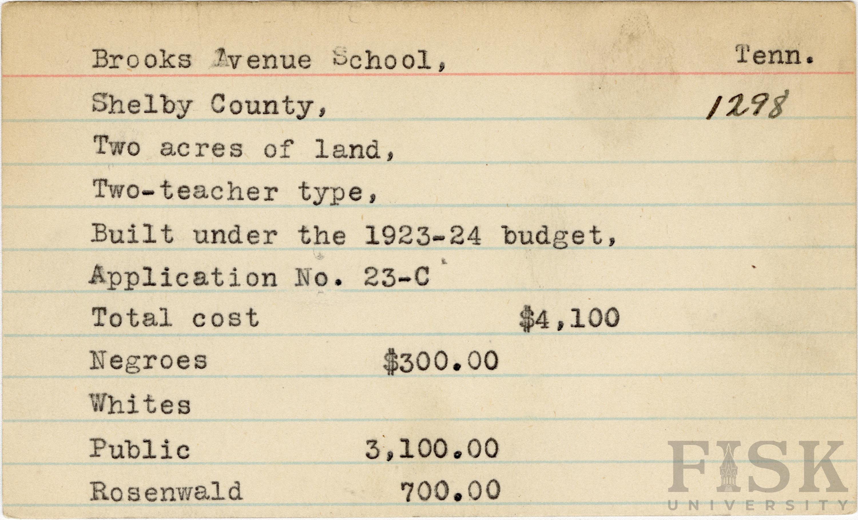 - School card from Rosenwald Fund for Brooks Avenue School in Shelby County, Tennessee
