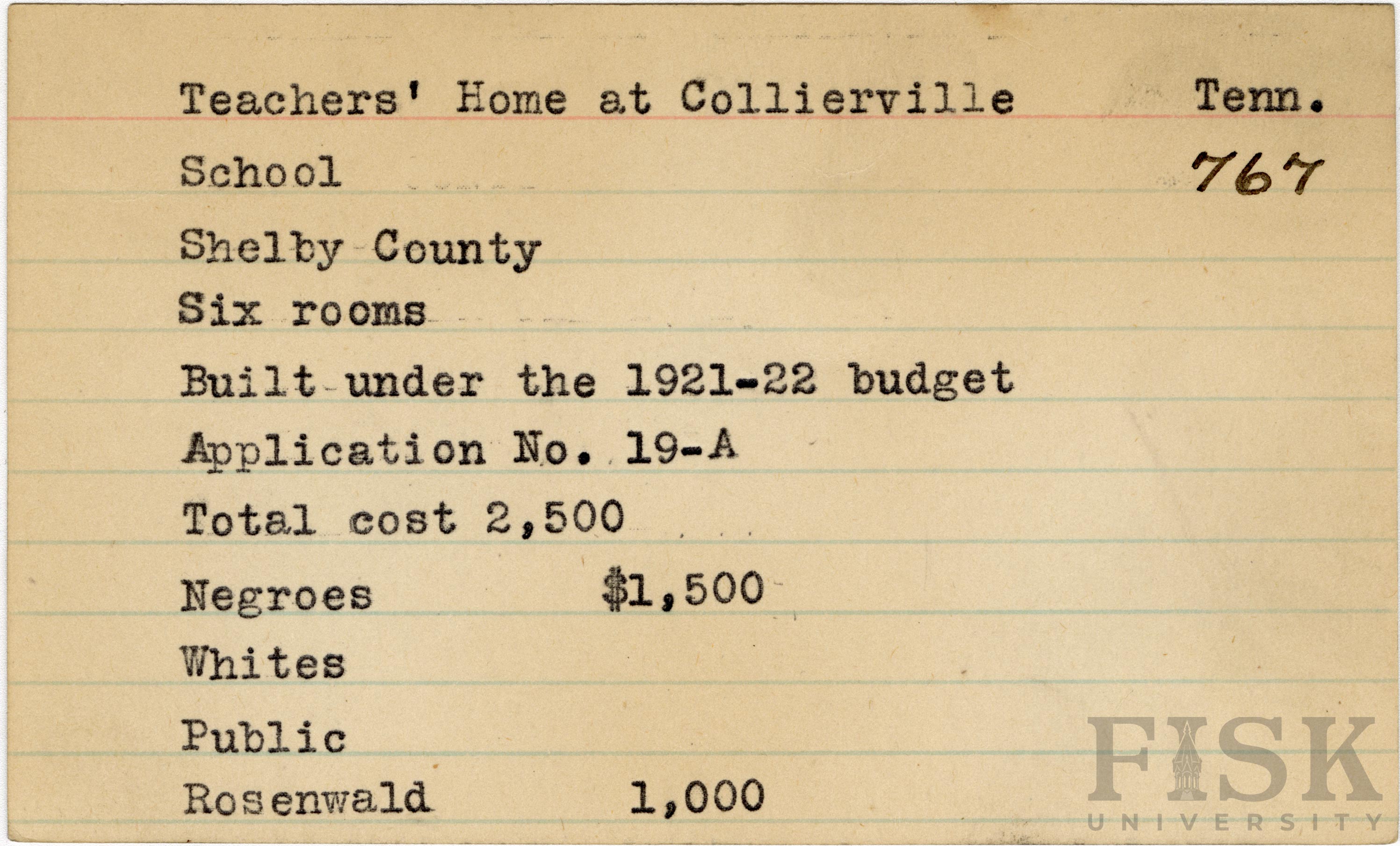 School card from Rosenwald Fund for the six room teacher's home at Collierville School in Shelby County, Tennessee with a section added to the budget contributions that says, "Ins. $800"