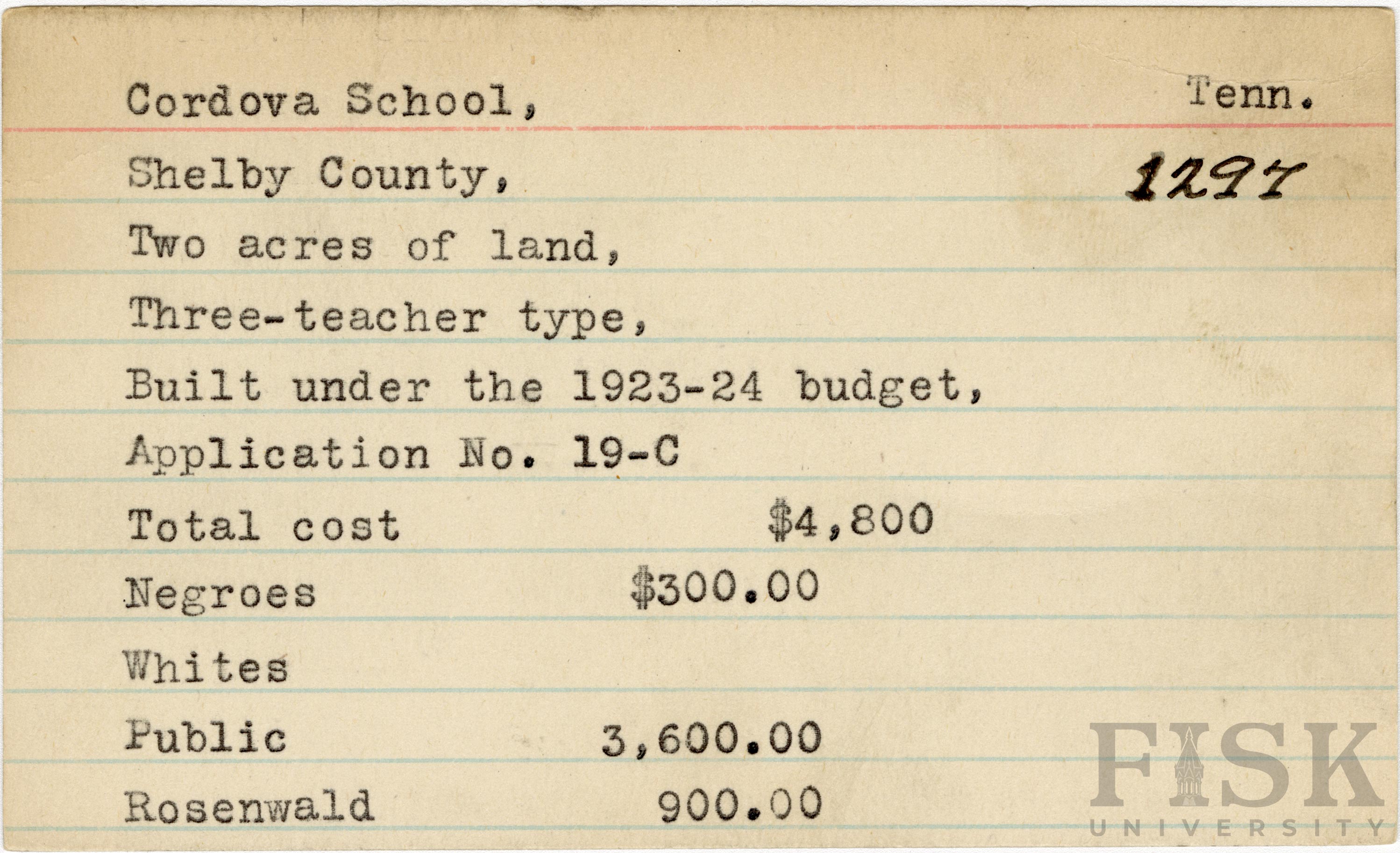 - School card from Rosenwald Fund for Cordova School in Shelby County, Tennessee