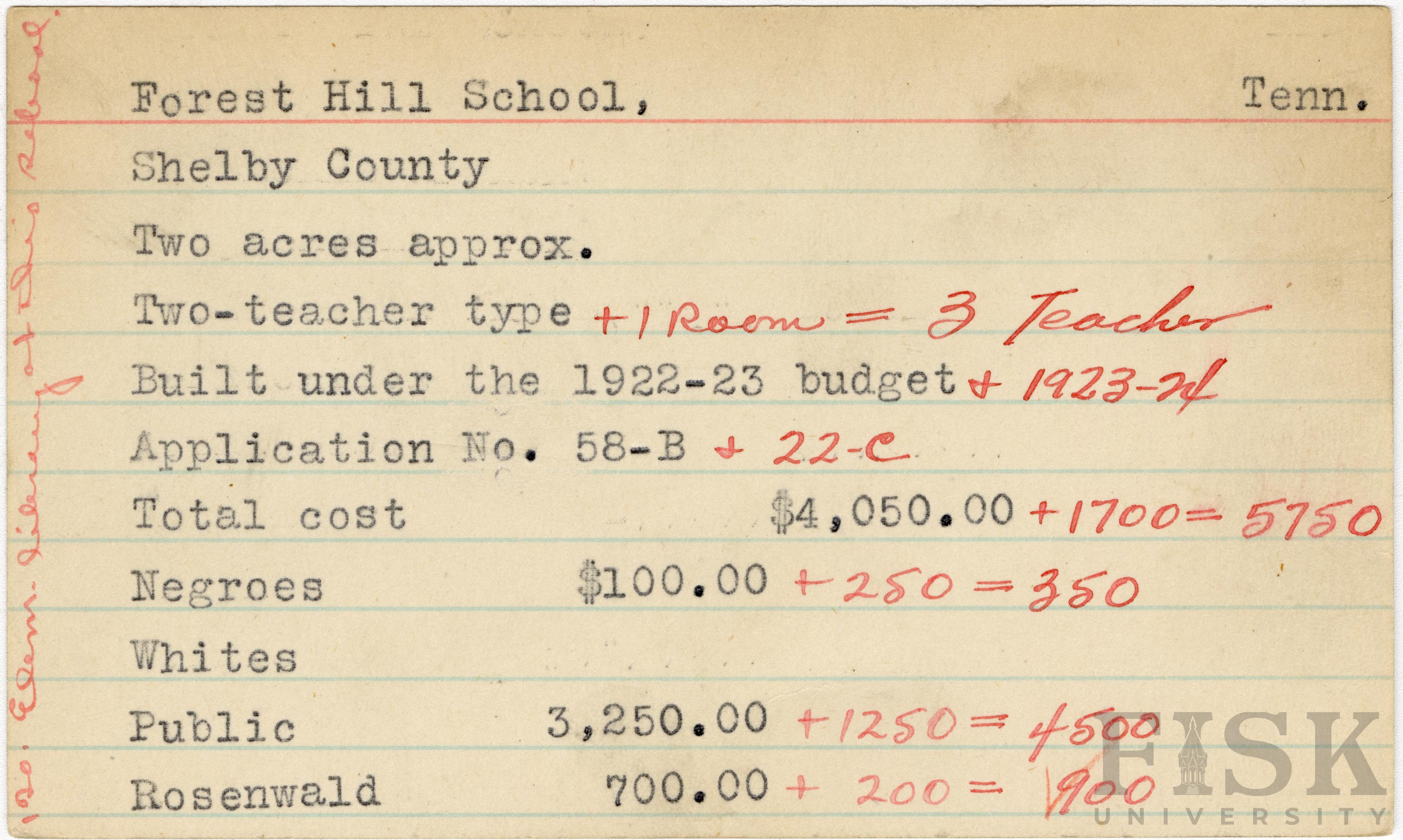 - School card from Rosenwald Fund for Forest Hill School in Shelby County, Tennessee with handwritten additions to the teacher type, budget year, application number, and budget contribution sections. A note on the card says, "$120 elem library at this school"