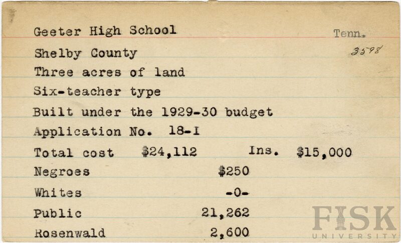 - School card from Rosenwald Fund for Geeter High School in Shelby County, Tennessee with a section added to the budget contributions that says, "Ins. $15,000"