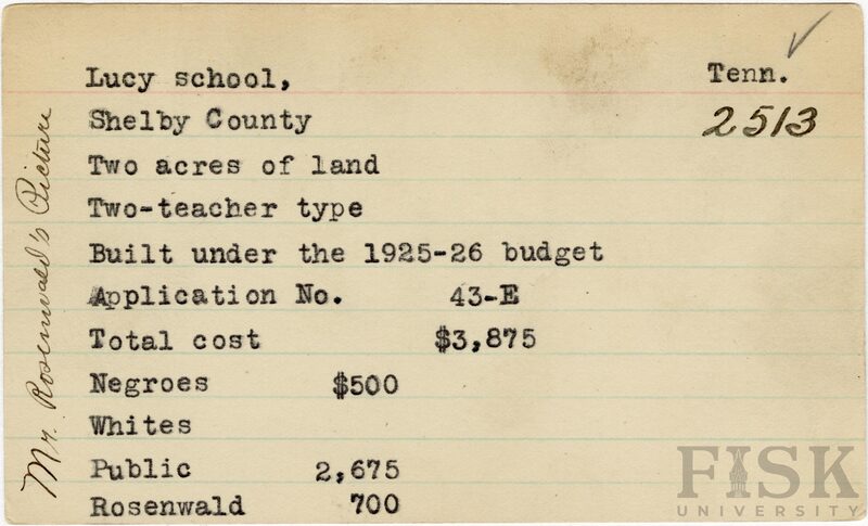 - School card from Rosenwald Fund for Lucy School in Shelby County, Tennessee with a note on the card that says, "Mr. Rosenwald's Picture"