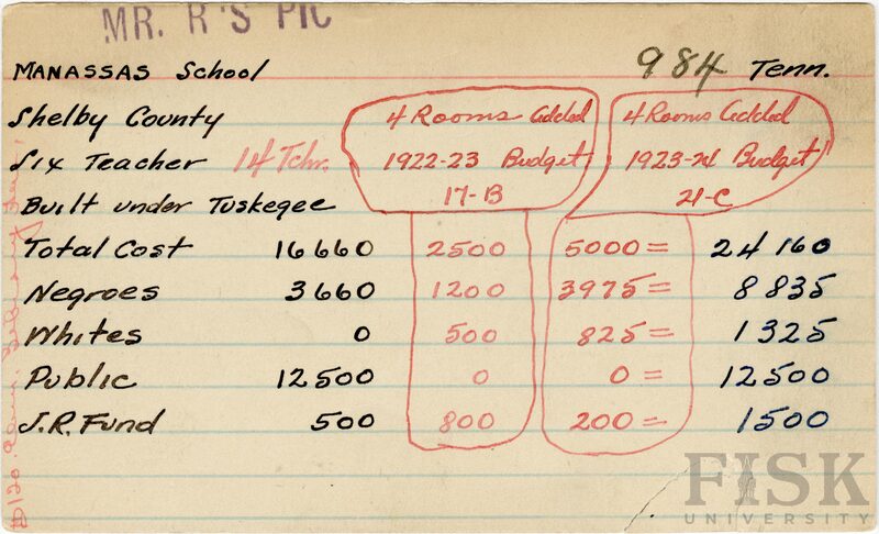- School card from Rosenwald Fund for Manassas School in Shelby County, Tennessee with notes on the card that say, "$120 elem library here" and "Mr. R's Pic"
