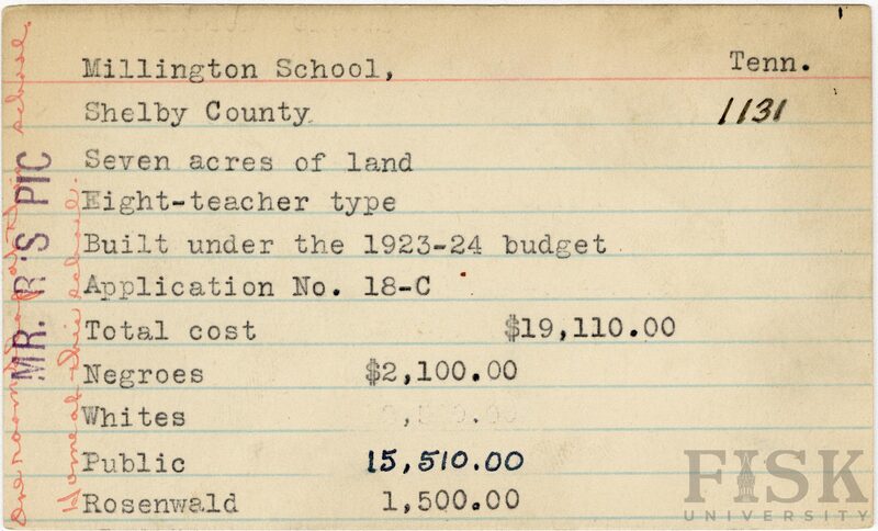 - School card from Rosenwald Fund for Millinton School in Shelby County, Tennessee with notes on the card that say, "one room shop at this school," "Mr. R's Pic," and "home at this school"