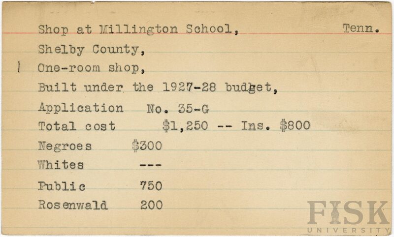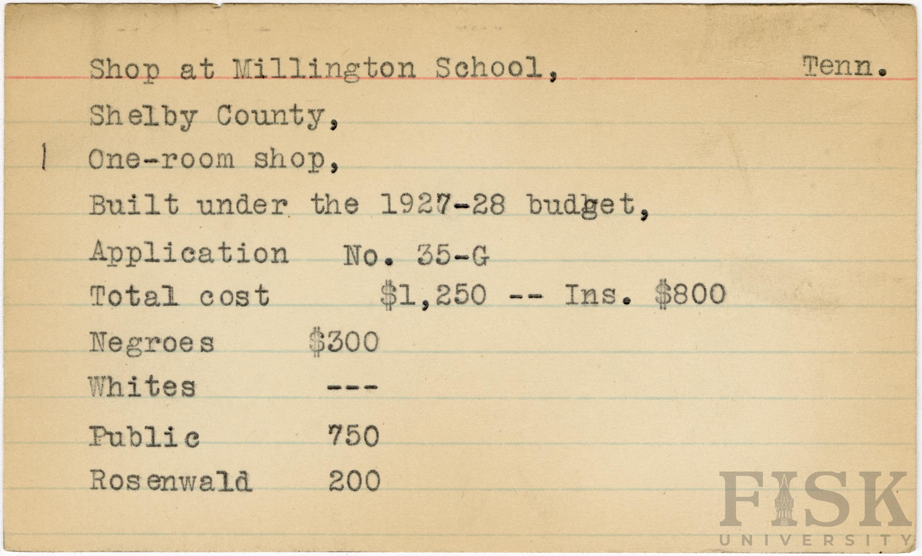 - School card from Rosenwald Fund for the one room shop at Millinton School in Shelby County, Tennessee with a section added to the budget contributions that says, "Ins. $800"