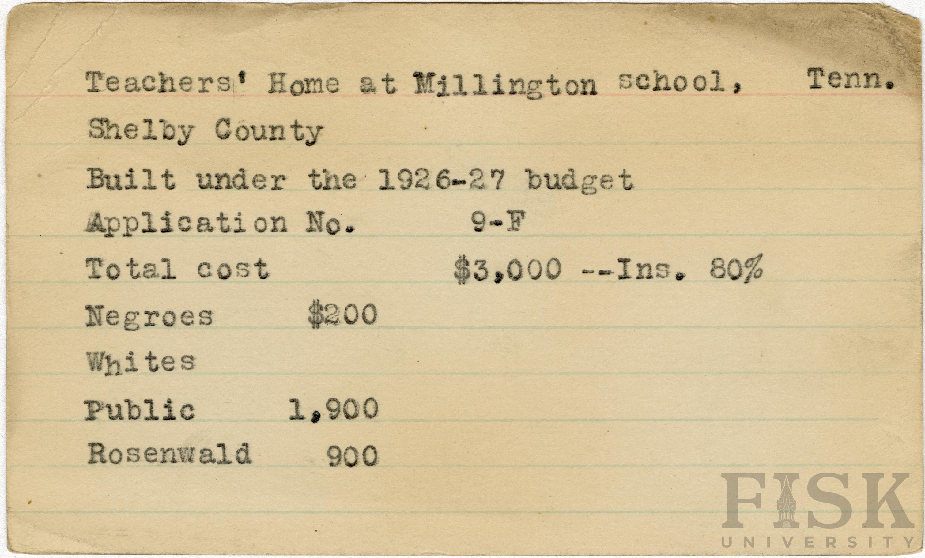 - School card from Rosenwald Fund for the teacher's home at Millinton School in Shelby County, Tennessee with a section added to the budget contributions that says, "Ins. 80%"