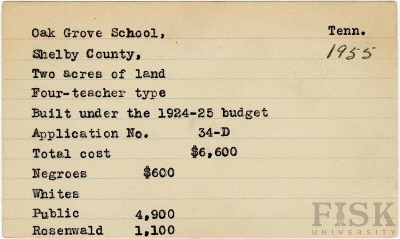 - School card from Rosenwald Fund for Oak Grove School in Shelby County, Tennessee