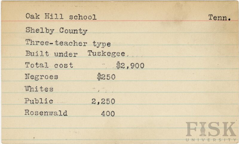 - School card from Rosenwald Fund for Oak Hill School in Shelby County, Tennessee