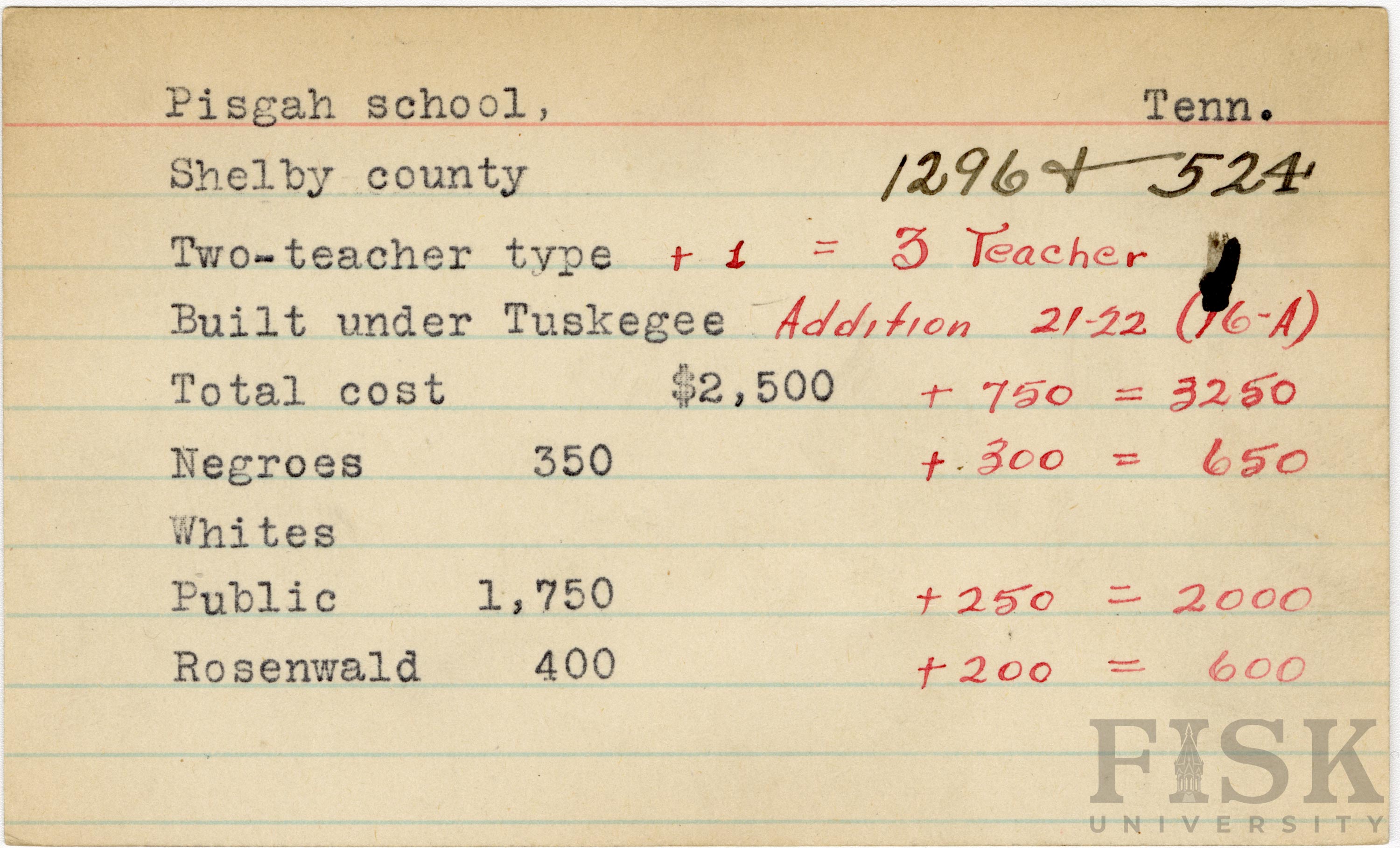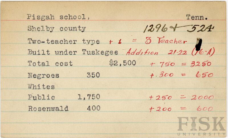 School card from Rosenwald Fund for Pisgah School in Shelby County, Tennessee with handwritten additions to the teacher type, budget year, application number, and budget contribution sections
