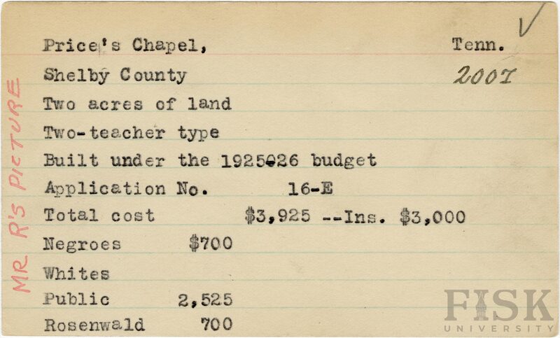- School card from Rosenwald Fund for Price's Chapel School in Shelby County, Tennessee with a section added to the budget contributions that says, "Ins. $3,000" and a note on the card that says, "Mr. R's Pic"