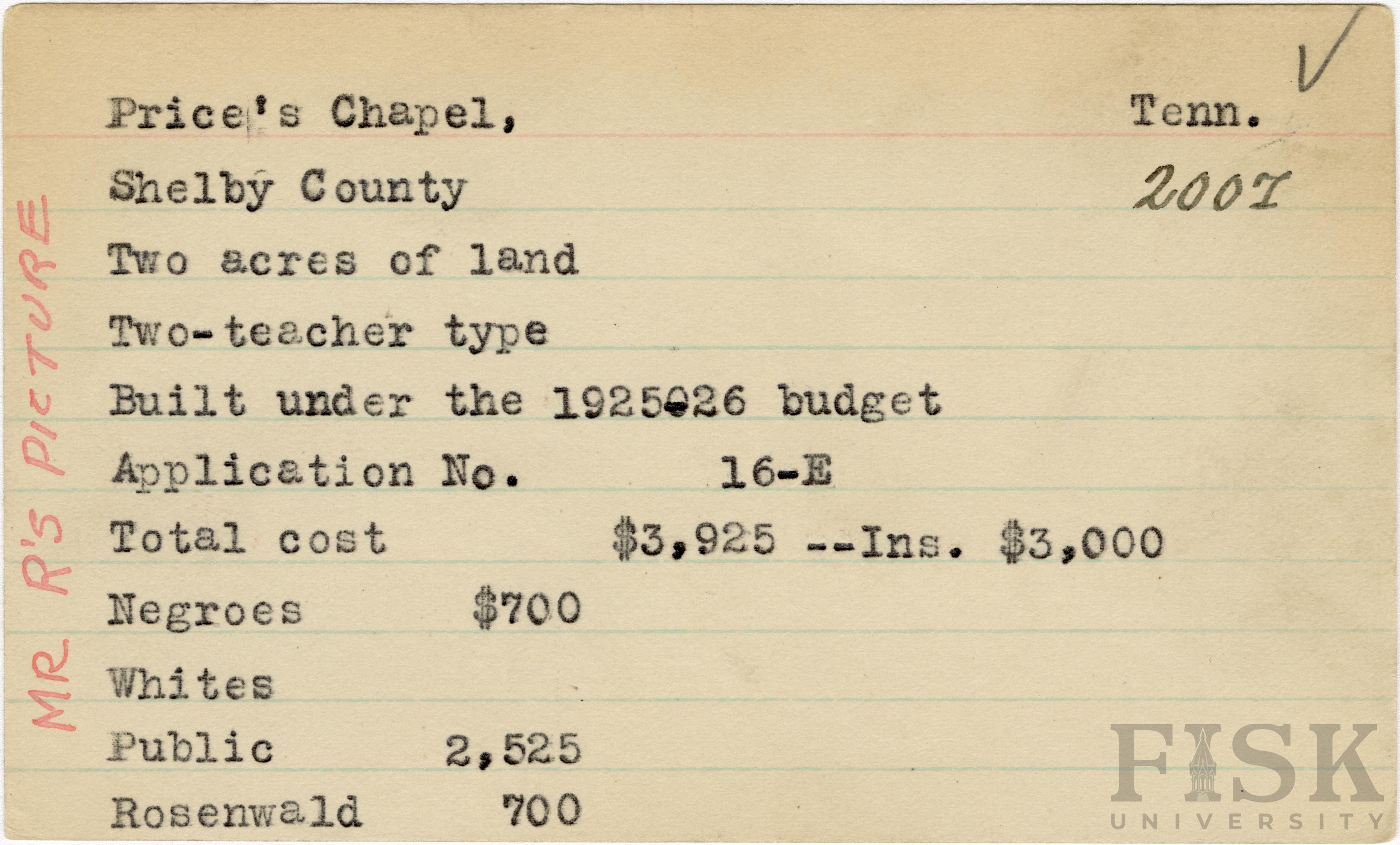 School card from Rosenwald Fund for Price's Chapel School in Shelby County, Tennessee with a section added to the budget contributions that says, "Ins. $3,000" and a note on the card that says, "Mr. R's Pic"