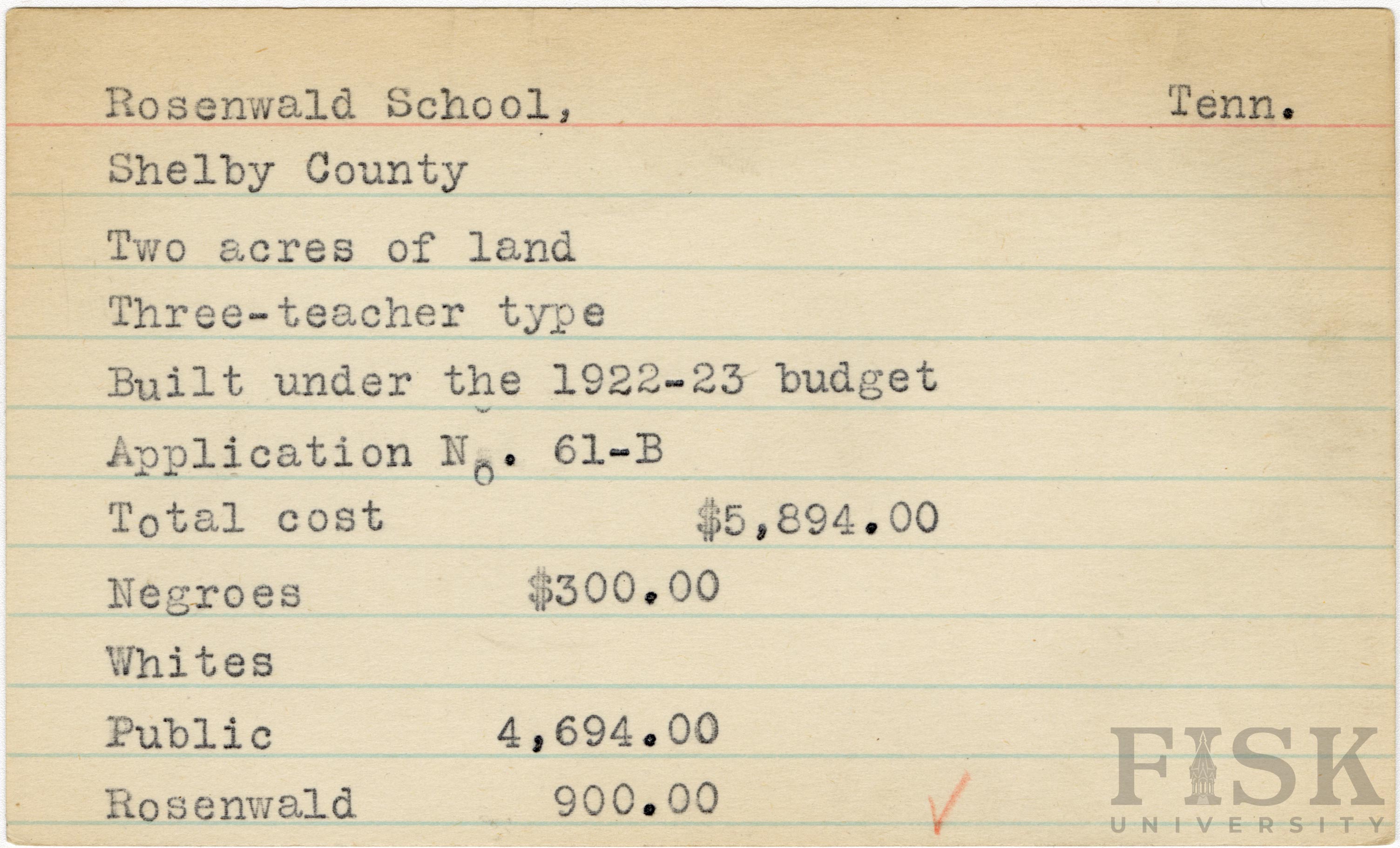 - School card from Rosenwald Fund for Rosenwald School in Shelby County, Tennessee
