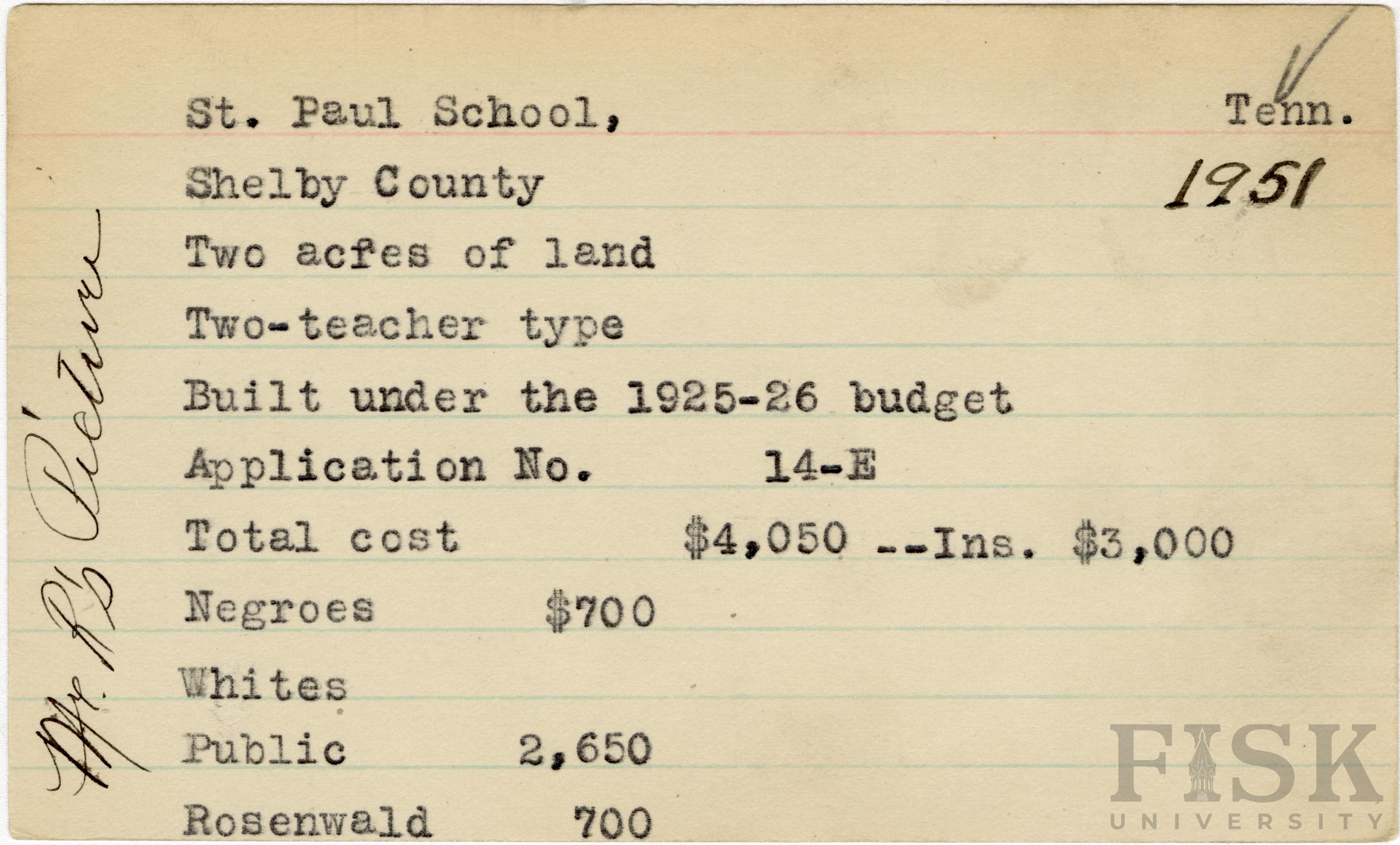- School card from Rosenwald Fund for St. Paul School in Shelby County, Tennessee with a section added to the budget contributions that says, "Ins. $3,000" and a note on the card that says, "Mr. R's Picture"