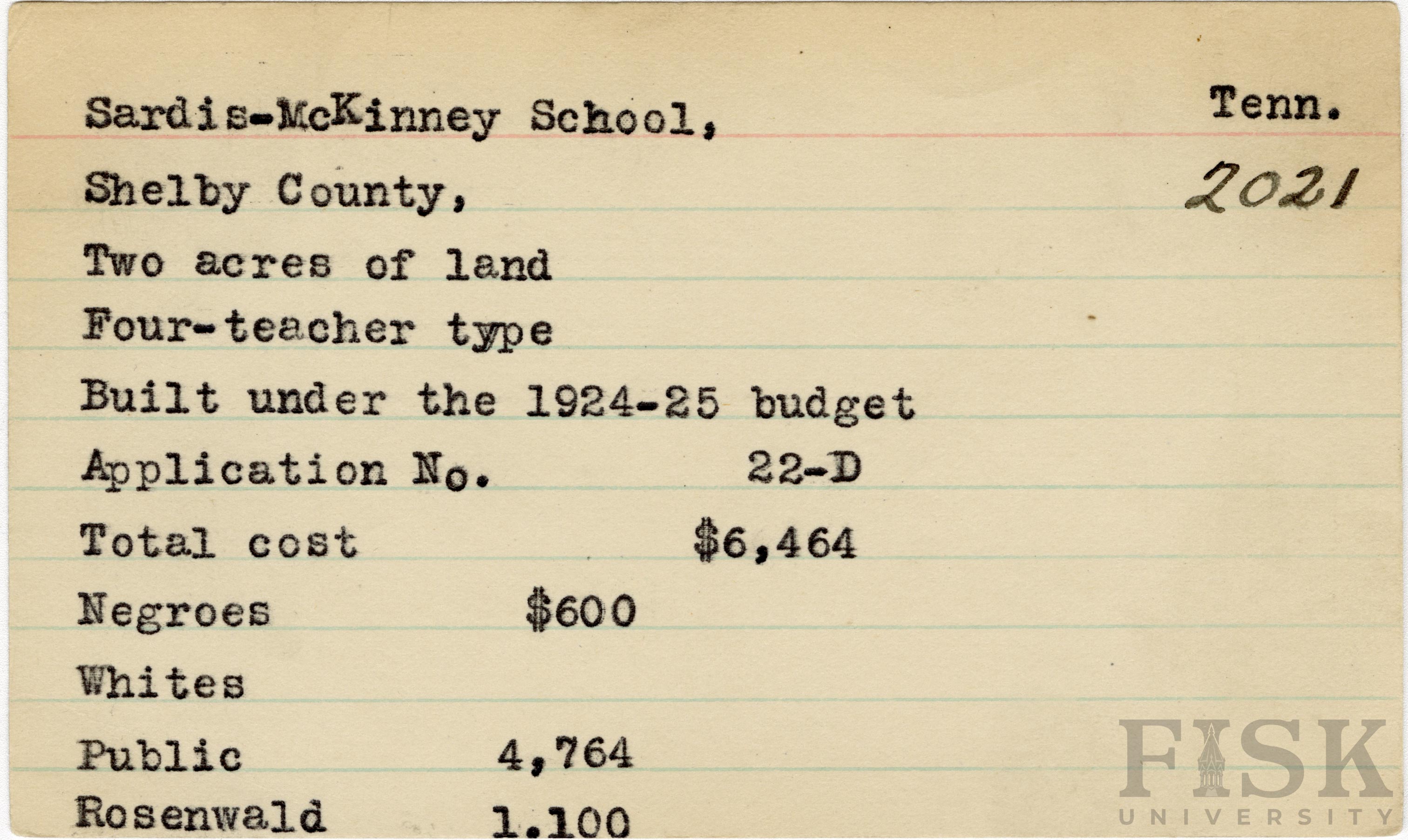 - School card from Rosenwald Fund for Sardis-McKinney School in Shelby County, Tennessee