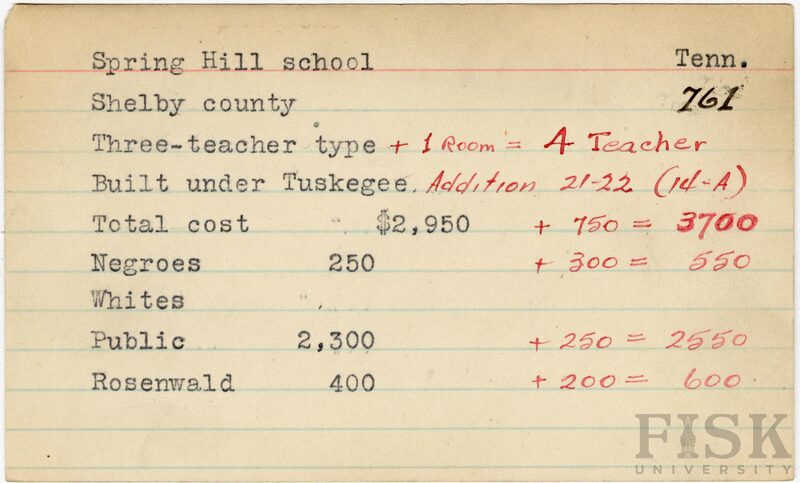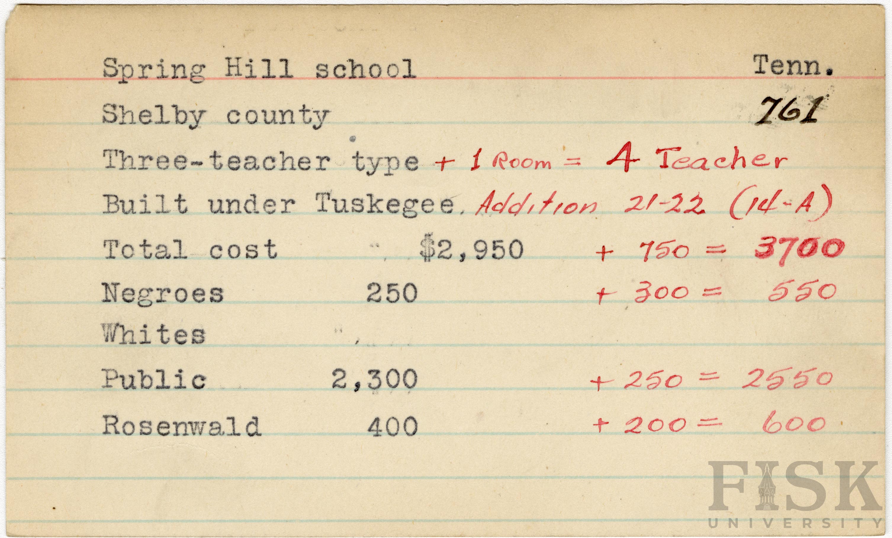 School card from Rosenwald Fund for Spring Hill School in Shelby County, Tennessee with handwritten additions to the teacher type, budget year, application number, and budget contribution sections