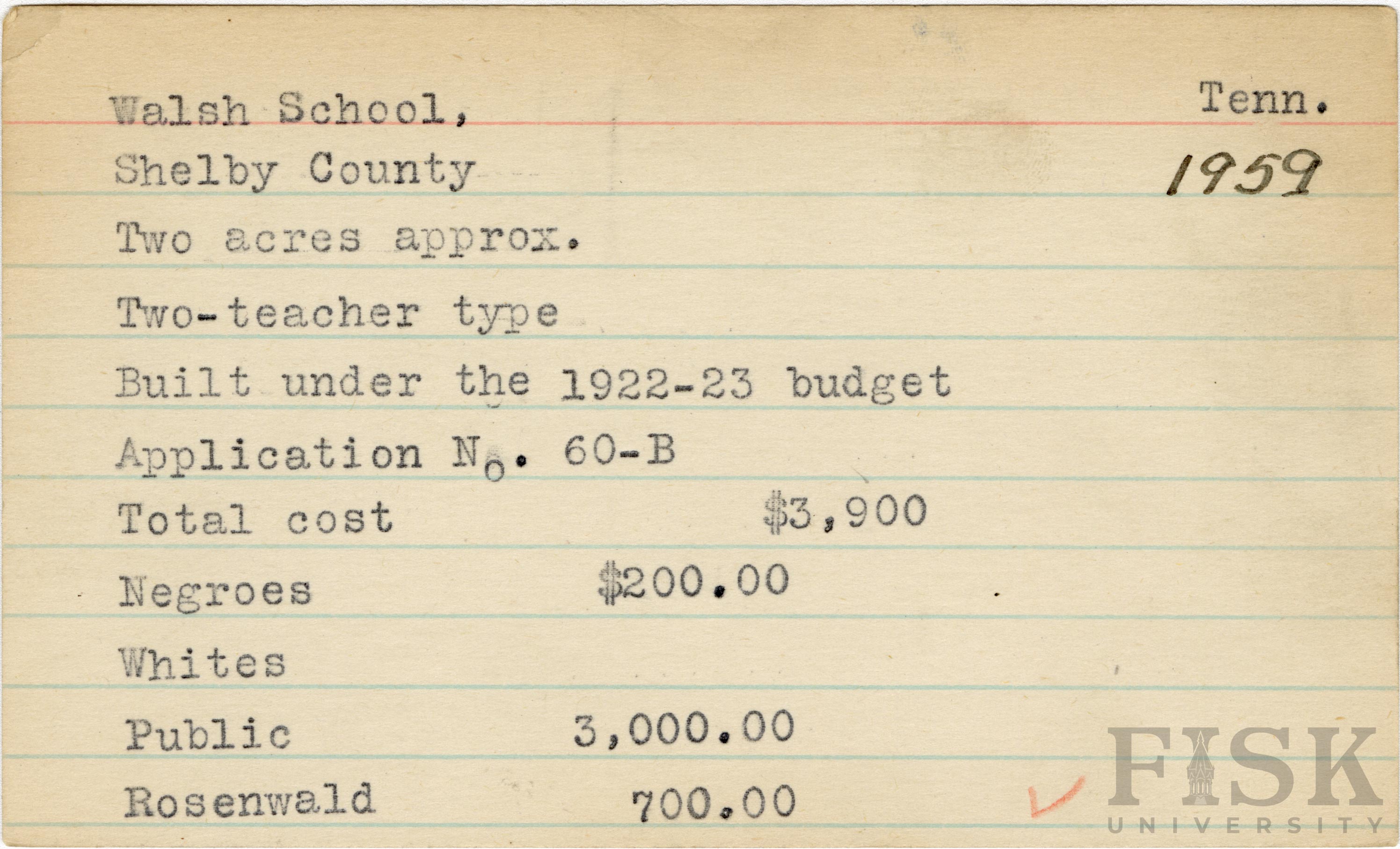 - School card from Rosenwald Fund for Walsh School in Shelby County, Tennessee