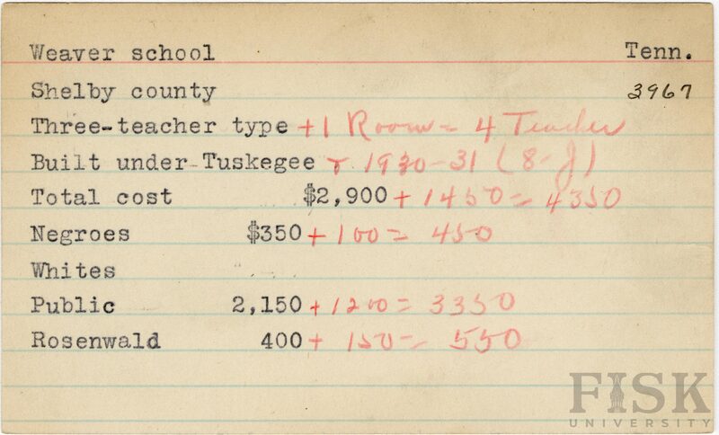 - School card from Rosenwald Fund for Weaver School in Shelby County, Tennessee with handwritten additions to the teacher type, budget year, application number, and budget contribution sections