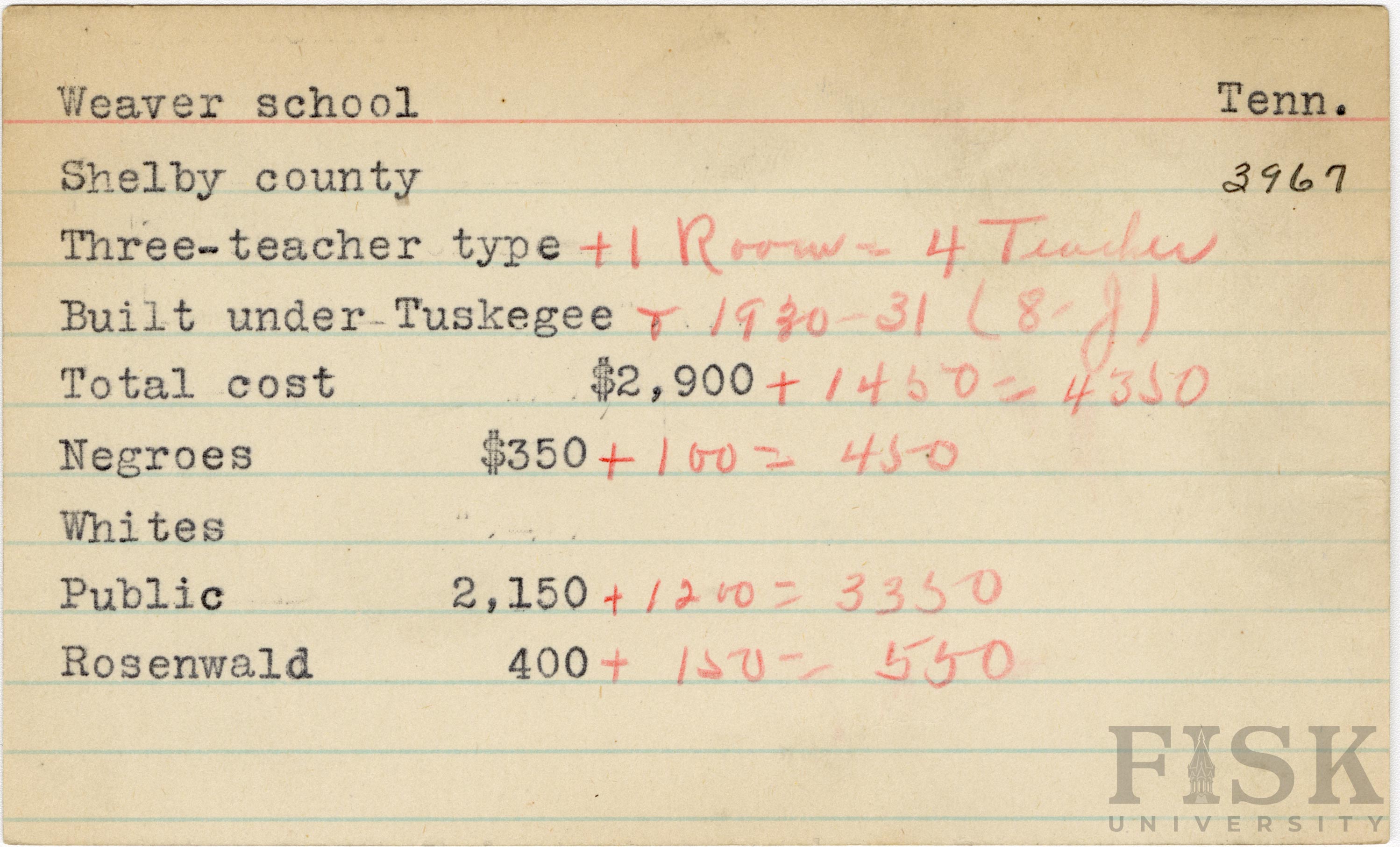 School card from Rosenwald Fund for Weaver School in Shelby County, Tennessee with handwritten additions to the teacher type, budget year, application number, and budget contribution sections