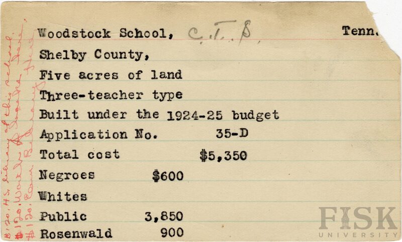 - School card from Rosenwald Fund for Woodstock School in Shelby County, Tennessee with notes on the card that say, "$120 H.S. library at this school," "$120 worth of books here," and "$120 elem library here"