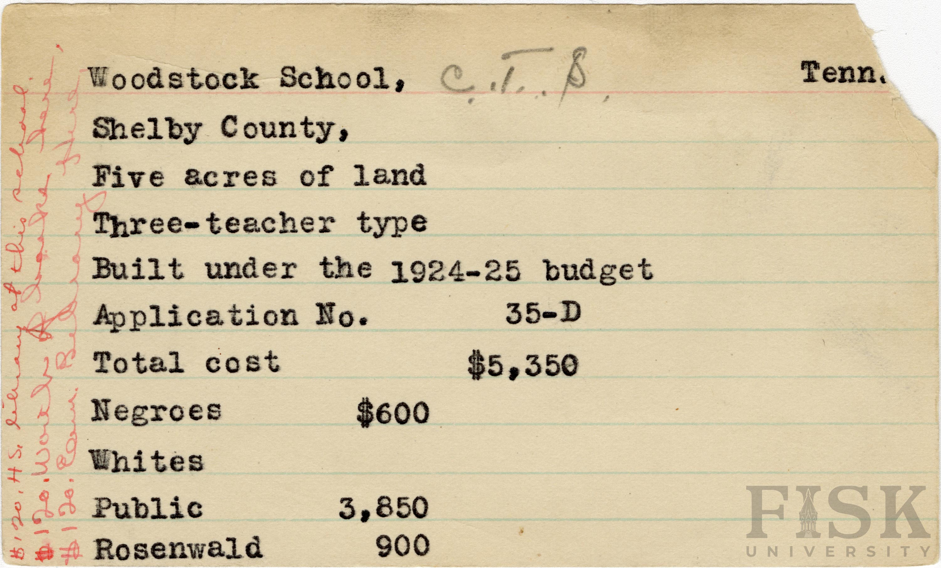 School card from Rosenwald Fund for Woodstock School in Shelby County, Tennessee with notes on the card that say, "$120 H.S. library at this school," "$120 worth of books here," and "$120 elem library here"
