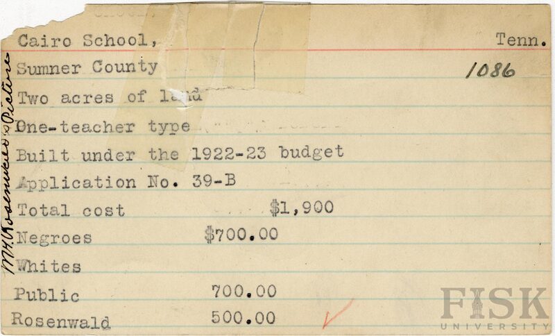 School card from Rosenwald Fund for Cairo School in Sumner County, Tennessee with a note on the card that says, "Mr. Rosenwald's Picture"