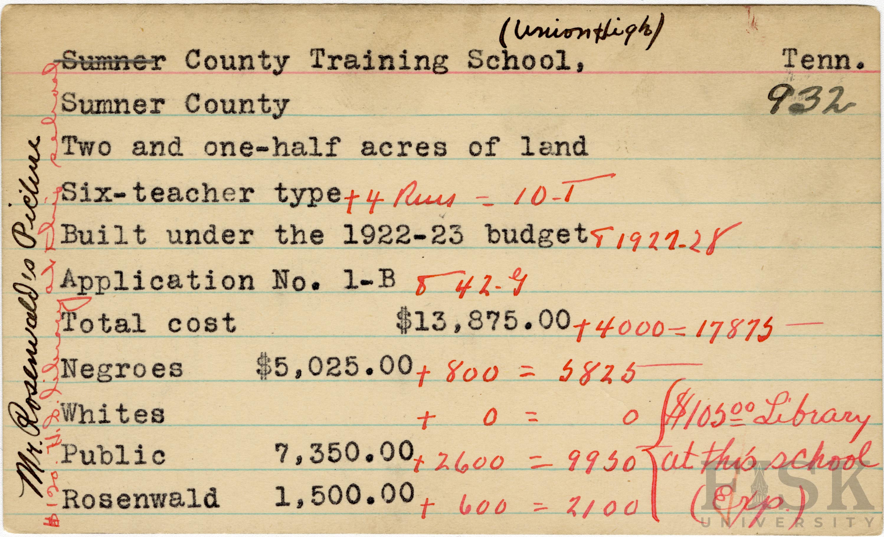 - School card from Rosenwald Fund for County Training School in Sumner County, Tennessee with handwritten additions to the teacher type, budget year, application number, and budget contribution sections. Handwritten notes on the card say, "Mr. Rosenwald's Picture," "$120 H.S. library at this school," and "$105.00 library at this school (Exp)"
