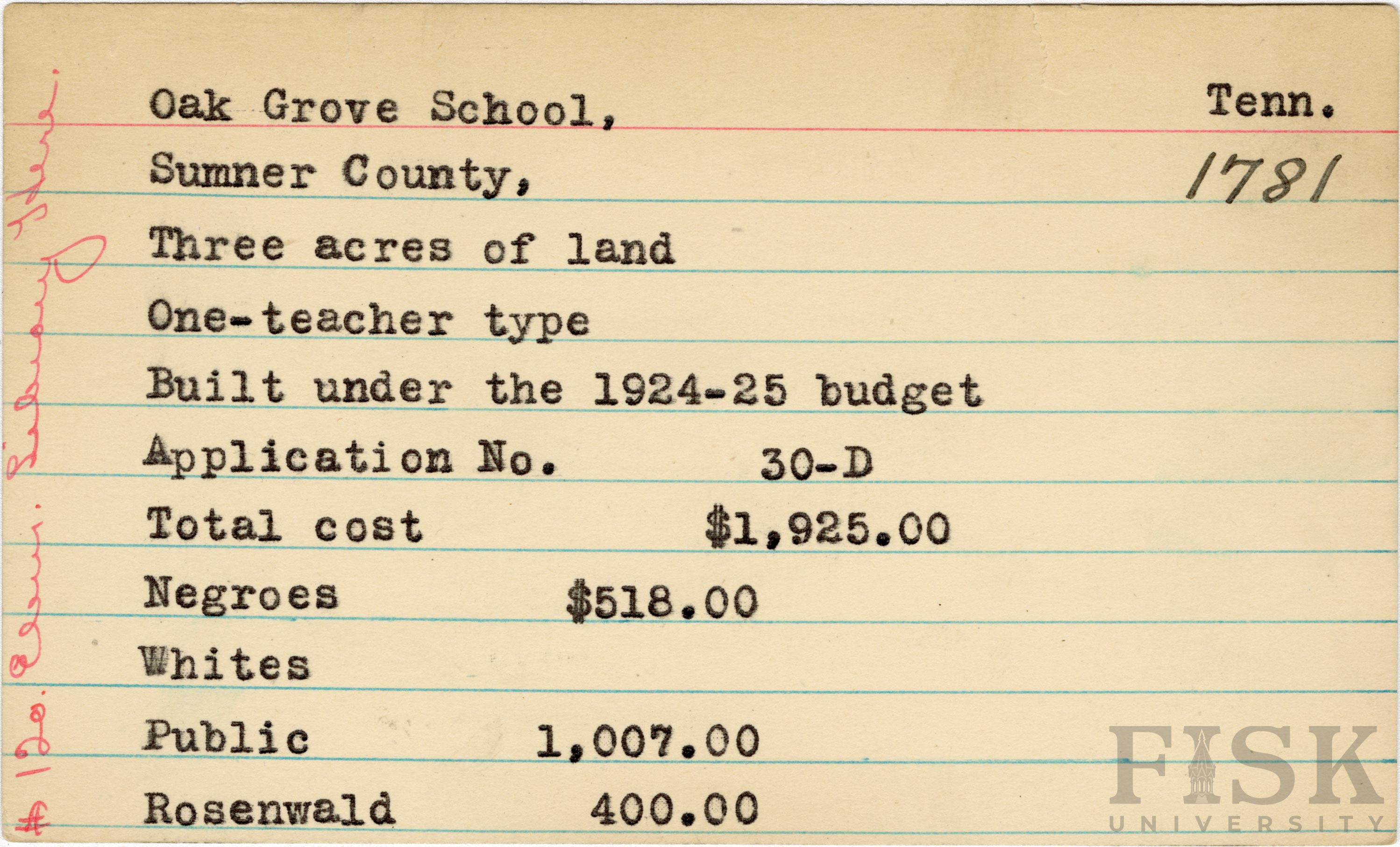 School card from Rosenwald Fund for Oak Grove School in Sumner County, Tennessee with a note on the card that says, "$120 elem library here"