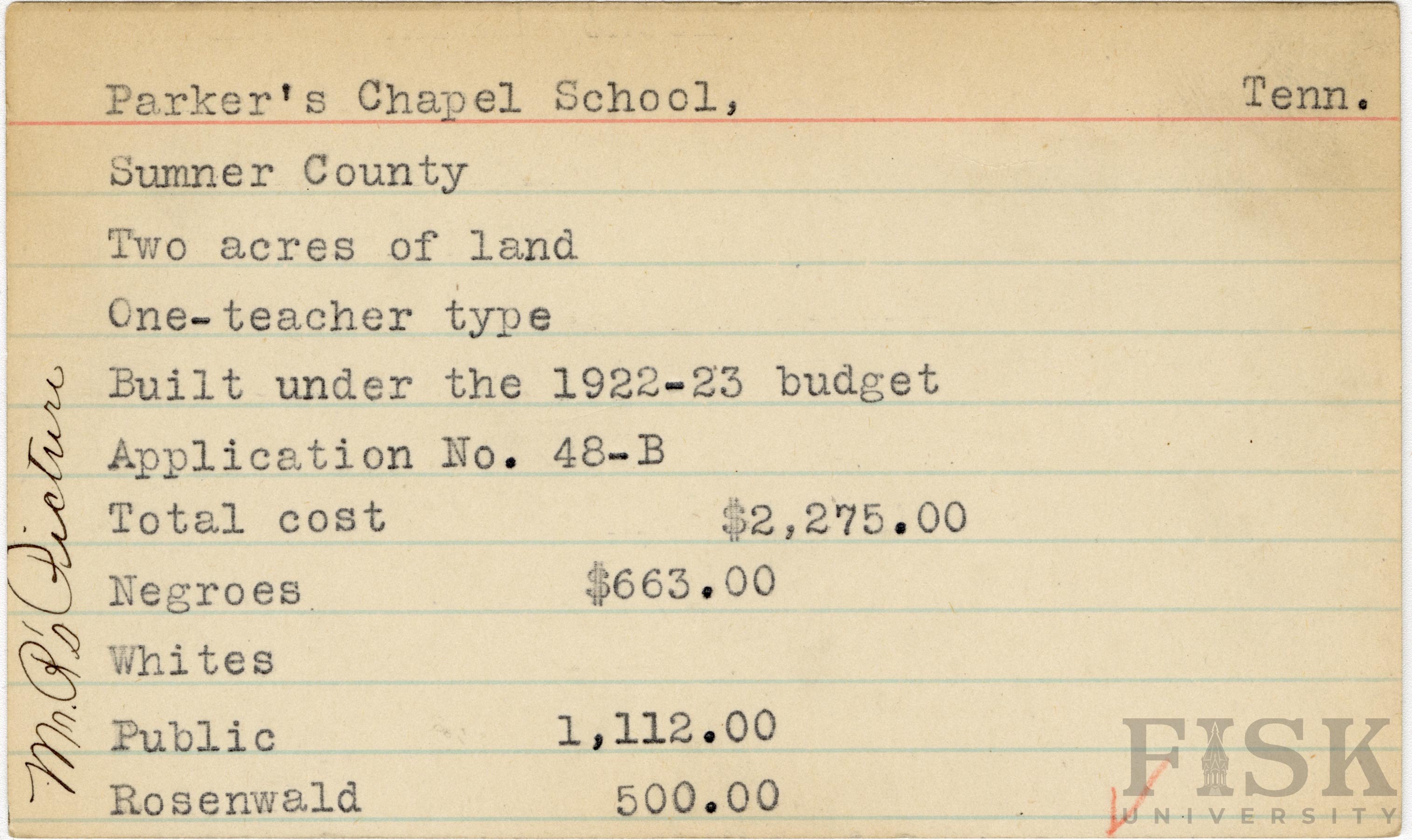 School card from Rosenwald Fund for Parker's Chapel School in Sumner County, Tennessee with a note on the card that says, "Mr. R's Picture"