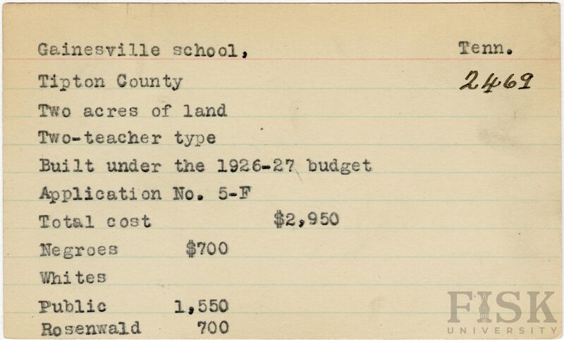 - School card from Rosenwald Fund for Gainesville School in Tipton County, Tennessee