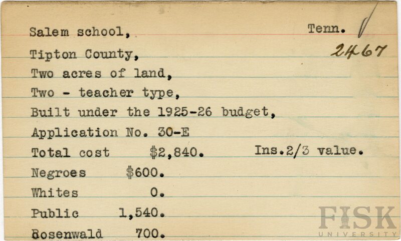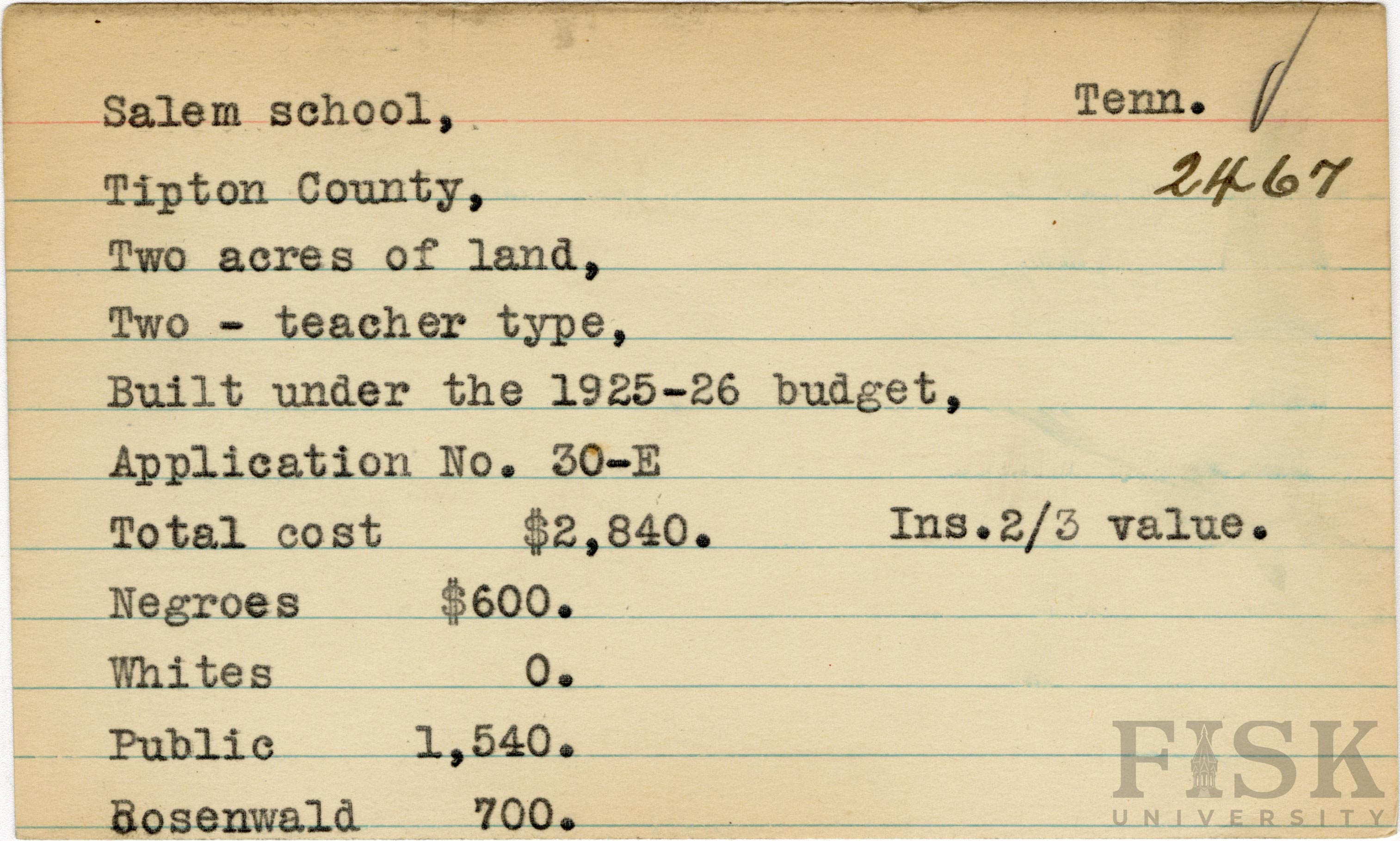- School card from Rosenwald Fund for Salem School in Tipton County, Tennessee with a section added to the budget contributions that says, "Ins. 2/3 value"