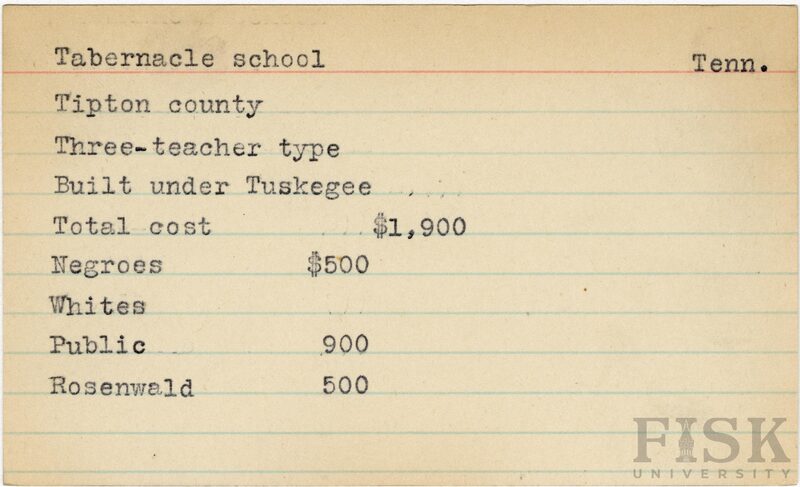 - School card from Rosenwald Fund for Tabernacle School in Tipton County, Tennessee