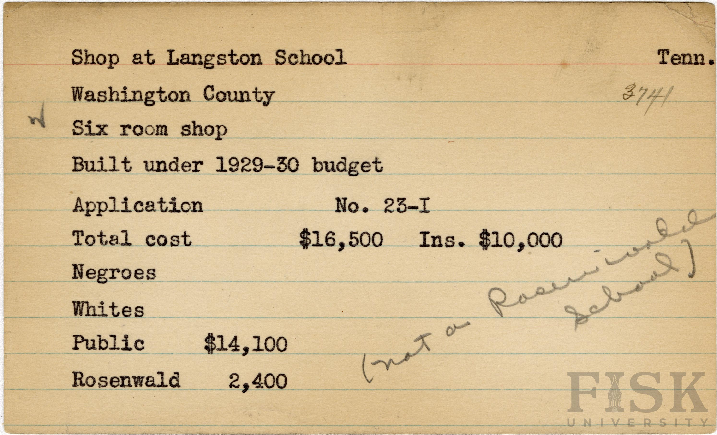 - School card from Rosenwald Fund for the six room shop at Langston School in Washington County, Tennessee with a section added to the budget contributions that says, "Ins. $10,000" and a note on the card that says, "(not a Rosenwald School)"