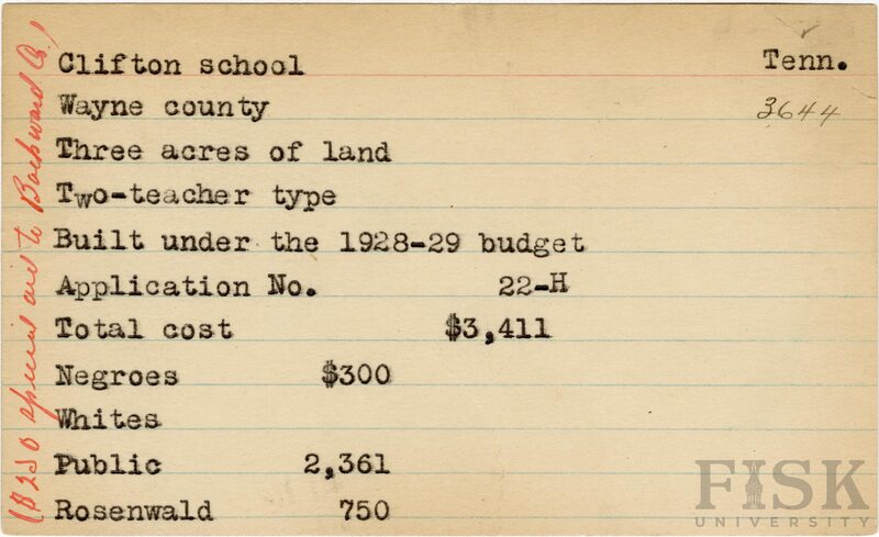 - School card from Rosenwald Fund for Clifton School in Wayne County, Tennessee with a note on the card that says, "($250 special aid to Backward Co.)"