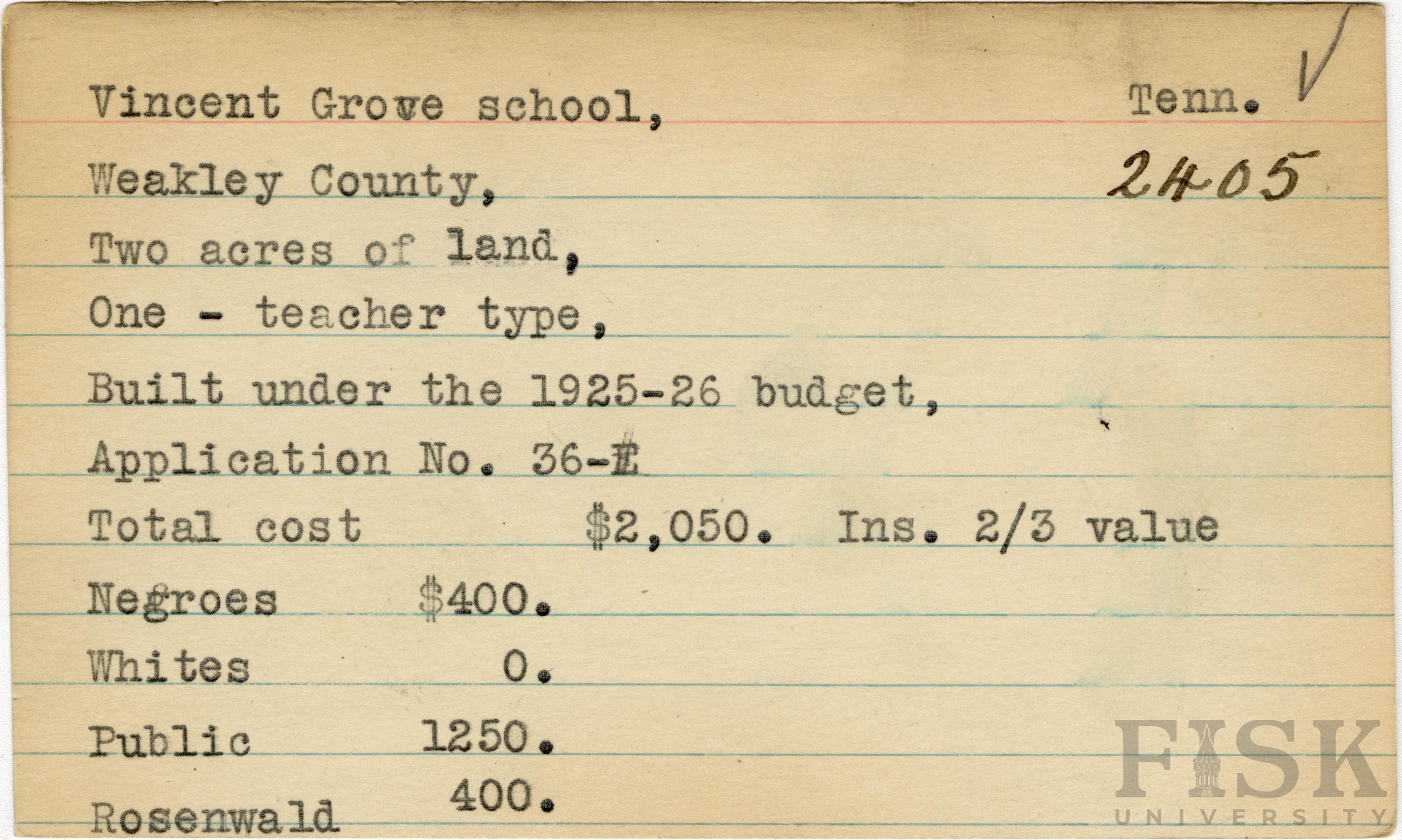 - School card from Rosenwald Fund for Vincent Grove School in Weakley County, Tennessee with a section added to the budget contributions that says, "Ins. 2/3 value"