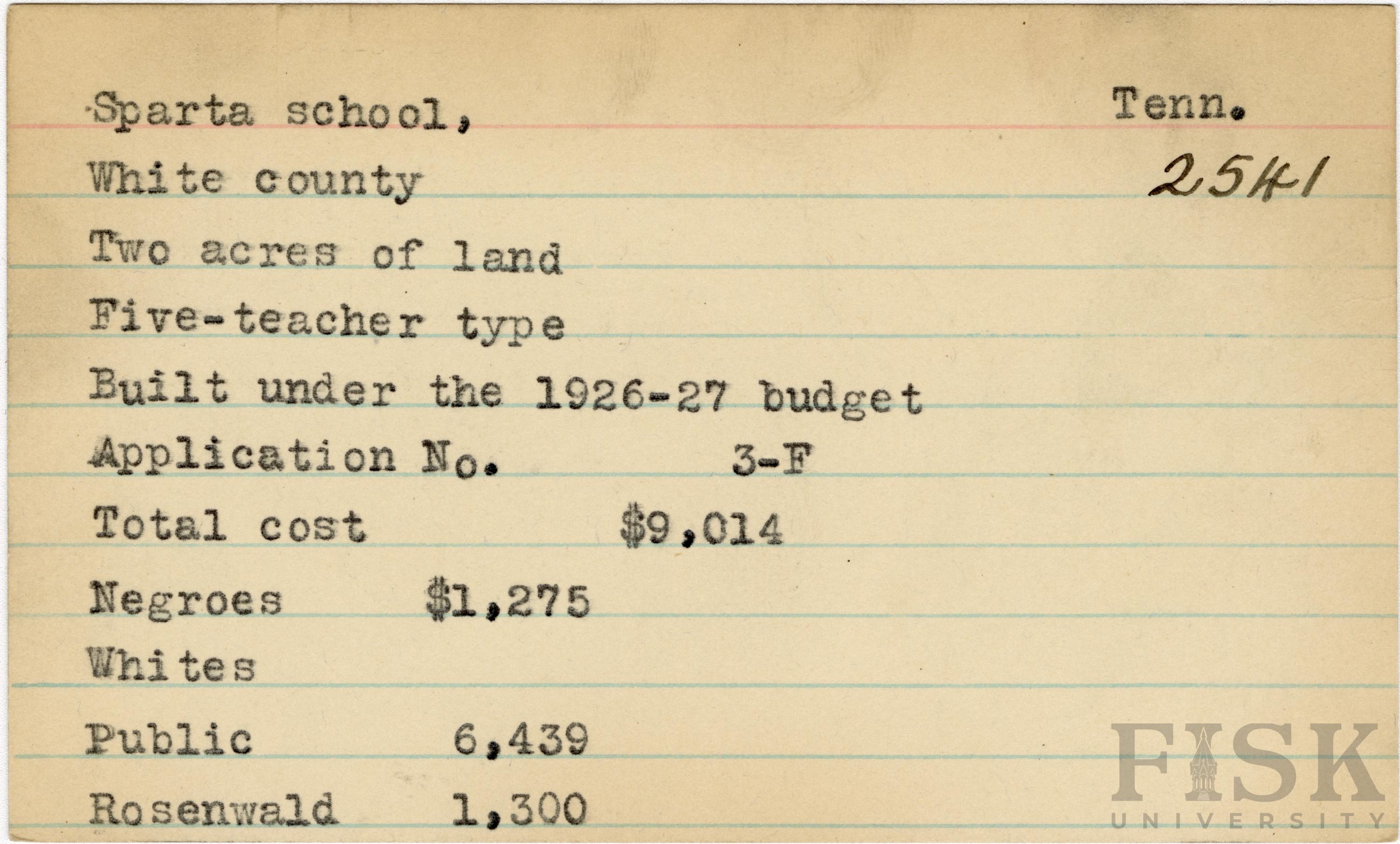 - School card from Rosenwald Fund for Sparta School in White County, Tennessee
