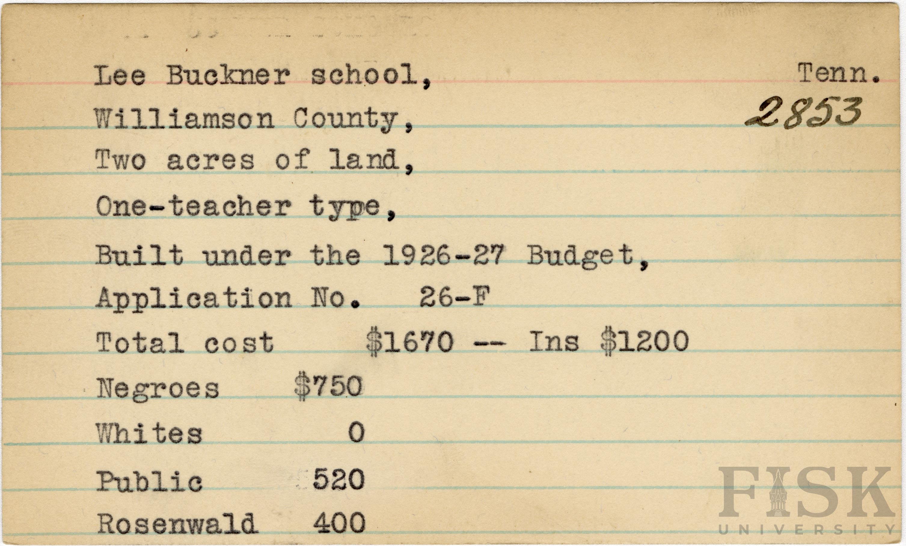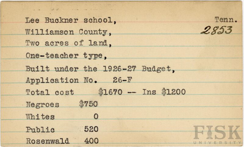 - School card from Rosenwald Fund for Lee Buckner School in Williamson County, Tennessee with a section added to the budget contributions that says, "Ins. $1,200"