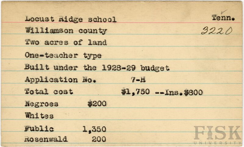 School card from Rosenwald Fund for Locust Ridge School in Williamson County, Tennessee with a section added to the budget contributions that says, "Ins. $800"