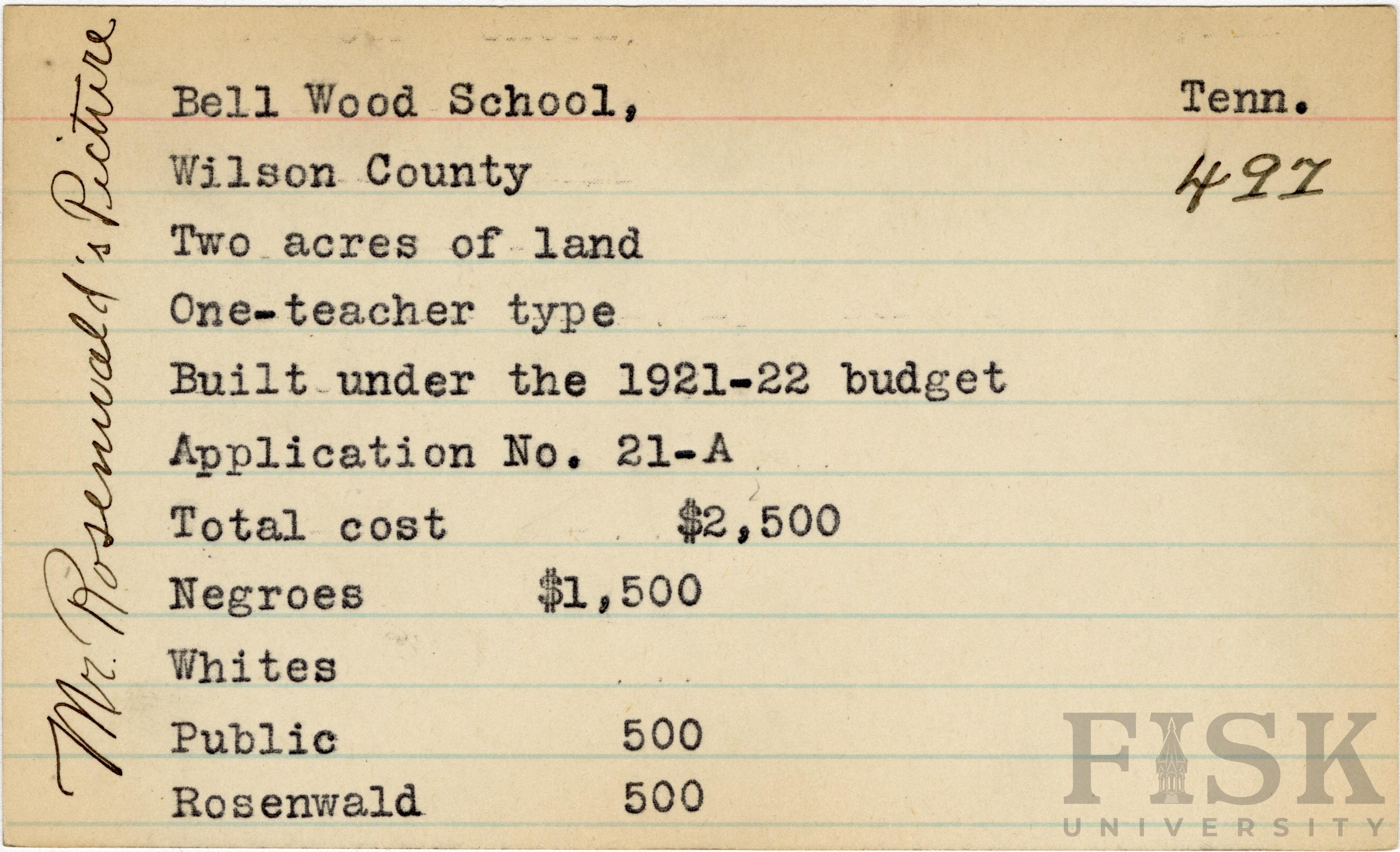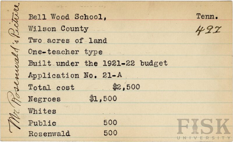 - School card from Rosenwald Fund for Bell Wood School in Wilson County, Tennessee with a note on the card that says, "Mr. Rosenwald's Picture"