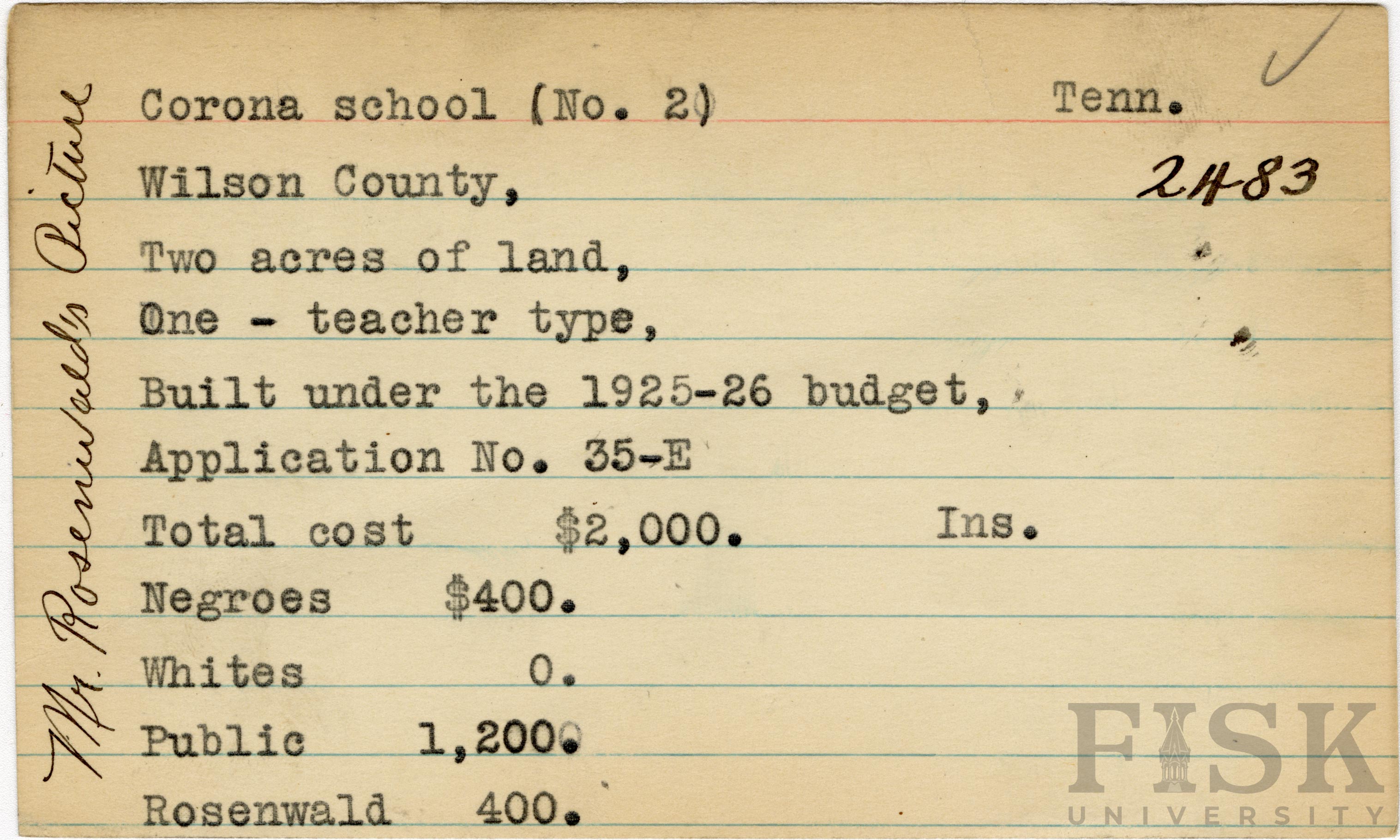 - School card from Rosenwald Fund for Corona School No. 2 in Wilson County, Tennessee with a note on the card that says, "Mr. Rosenwald's Picture"