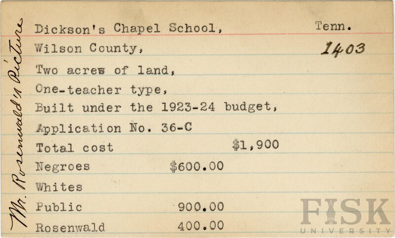 School card from Rosenwald Fund for Dickson's Chapel School in Wilson County, Tennessee with a note on the card that says, "Mr. Rosenwald's Picture"