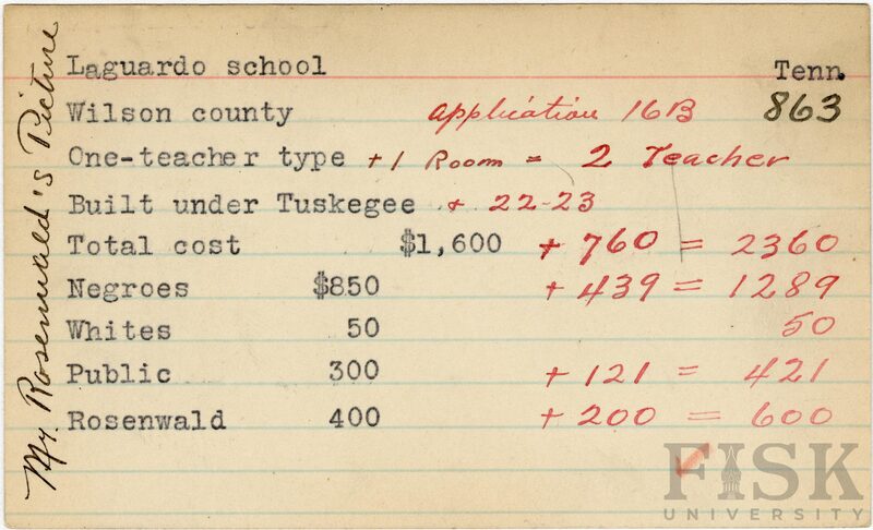 - School card from Rosenwald Fund for Laguardo School in Wilson County, Tennessee with handwritten additions to the teacher type, budget year, application number, and budget contribution sections. A note on the card says, "Mr. Rosenwald's Picture"