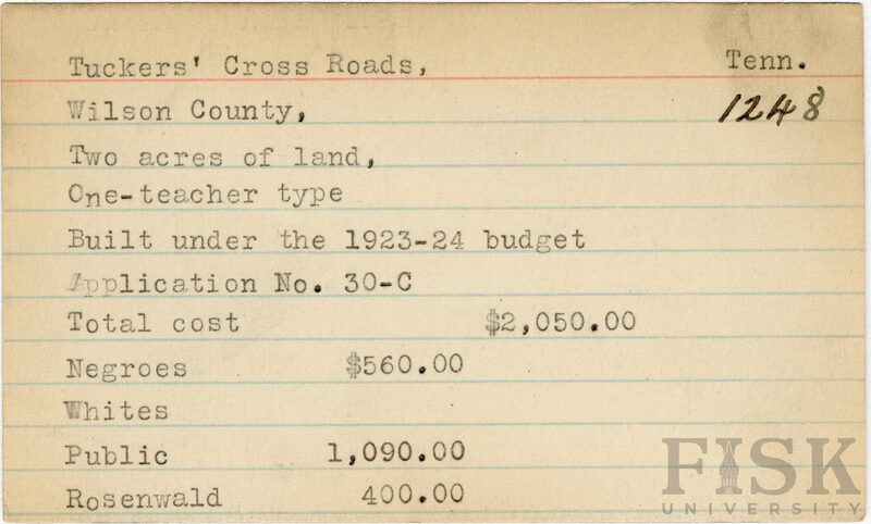 School card from Rosenwald Fund for Tucker's Cross Roads School in Wilson County, Tennessee